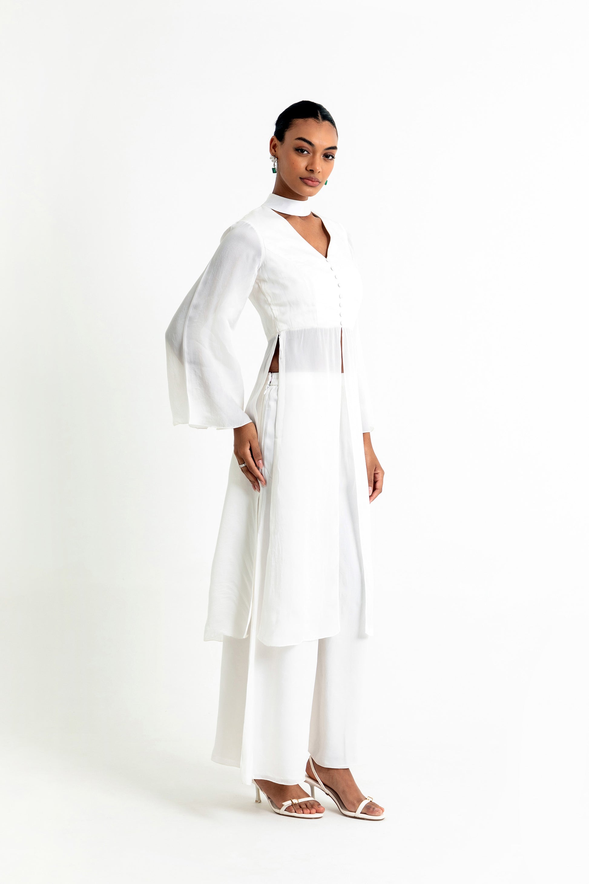 Effortless elegance meets contemporary flair in this pristine Amelia Co ord set. Featuring a flattering V-neckline, sheer full sleeves, and a structured bodice that flows into a fluid overlay, this ensemble redefines modern occasion wear. Paired with flared trouse, it’s perfect for intimate celebrations or elevated resort soirées.