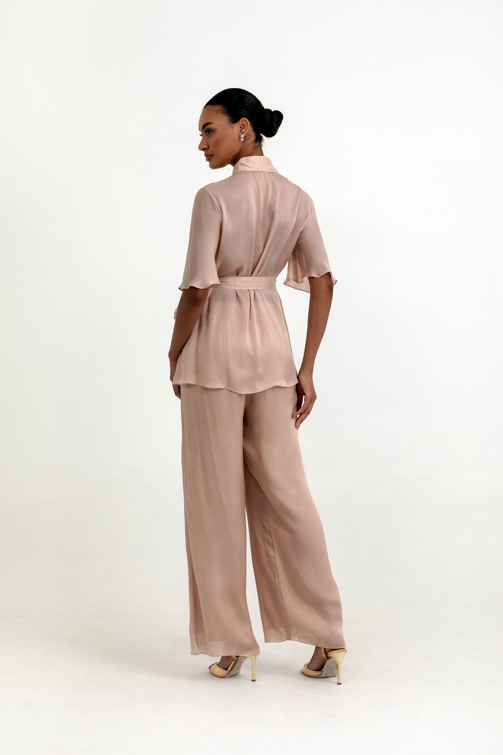 A masterclass in undetated luxury, this flowing Ara co-ord is crafted from whisper-soft cupro satin that moves like a second skin. The fluid silhouette is elevated by a tailored shirt with flared sleeves and a minimal stone chain embellishment. A matching self-tie belt cinches the waist with relaxed sophistication. Paired with wide-leg trouse, this look blends ease with refinement—perfect for modern soirées or serene escapes.