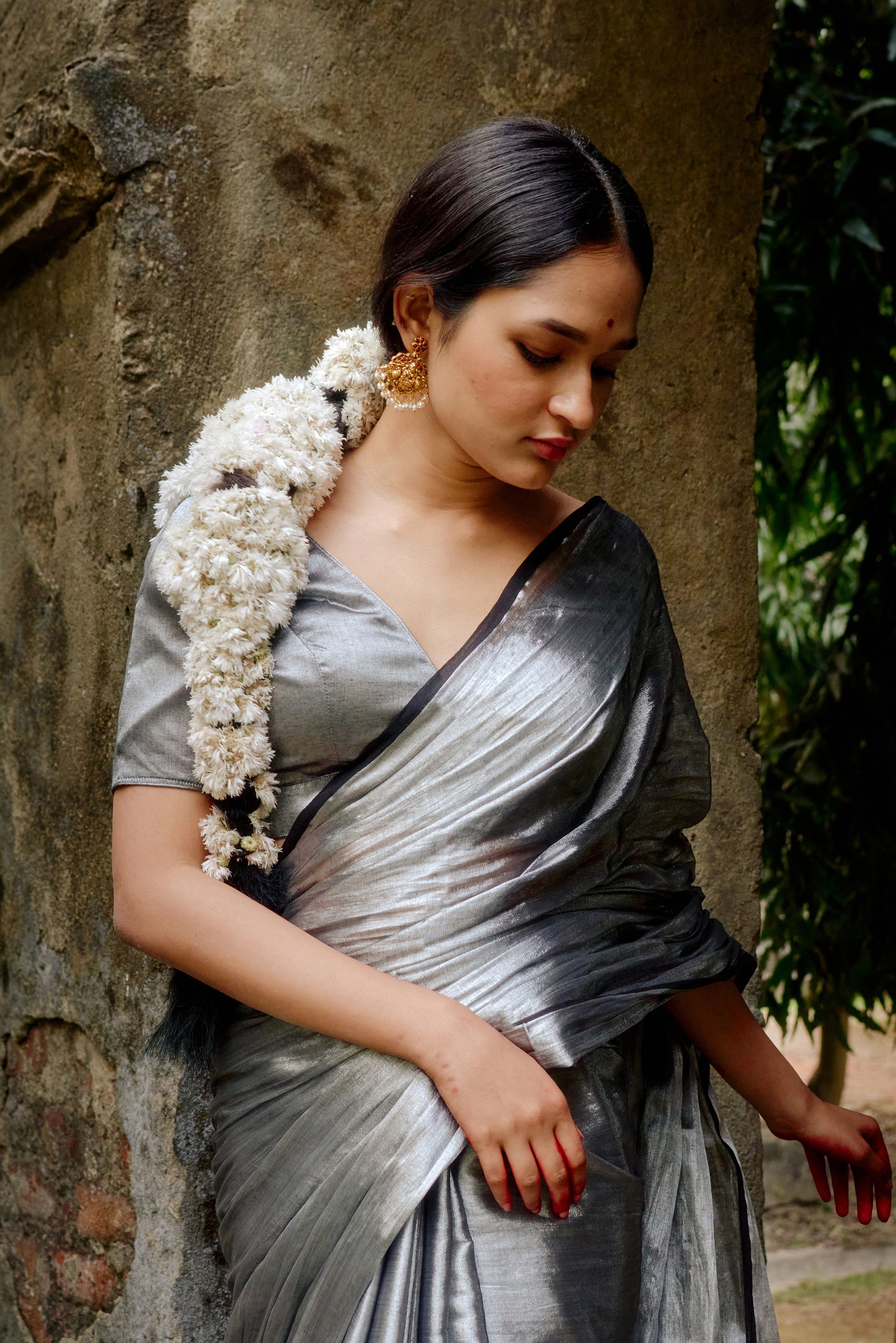 Step into a world of refined grace with our dark grey tissue saree – a symphony of sophistication and creativity. The intricate weaving of delicate tissue fabric drapes you in understated luxury. The dark hue adds a touch of mystery, while the artistic details evoke a sense of timeless beauty. This saree is not just attire; it's a canvas of craftsmanship, a celebration of style, and an embodiment of your unique elegance. Make a statement that whispers volumes with every elegant drape.