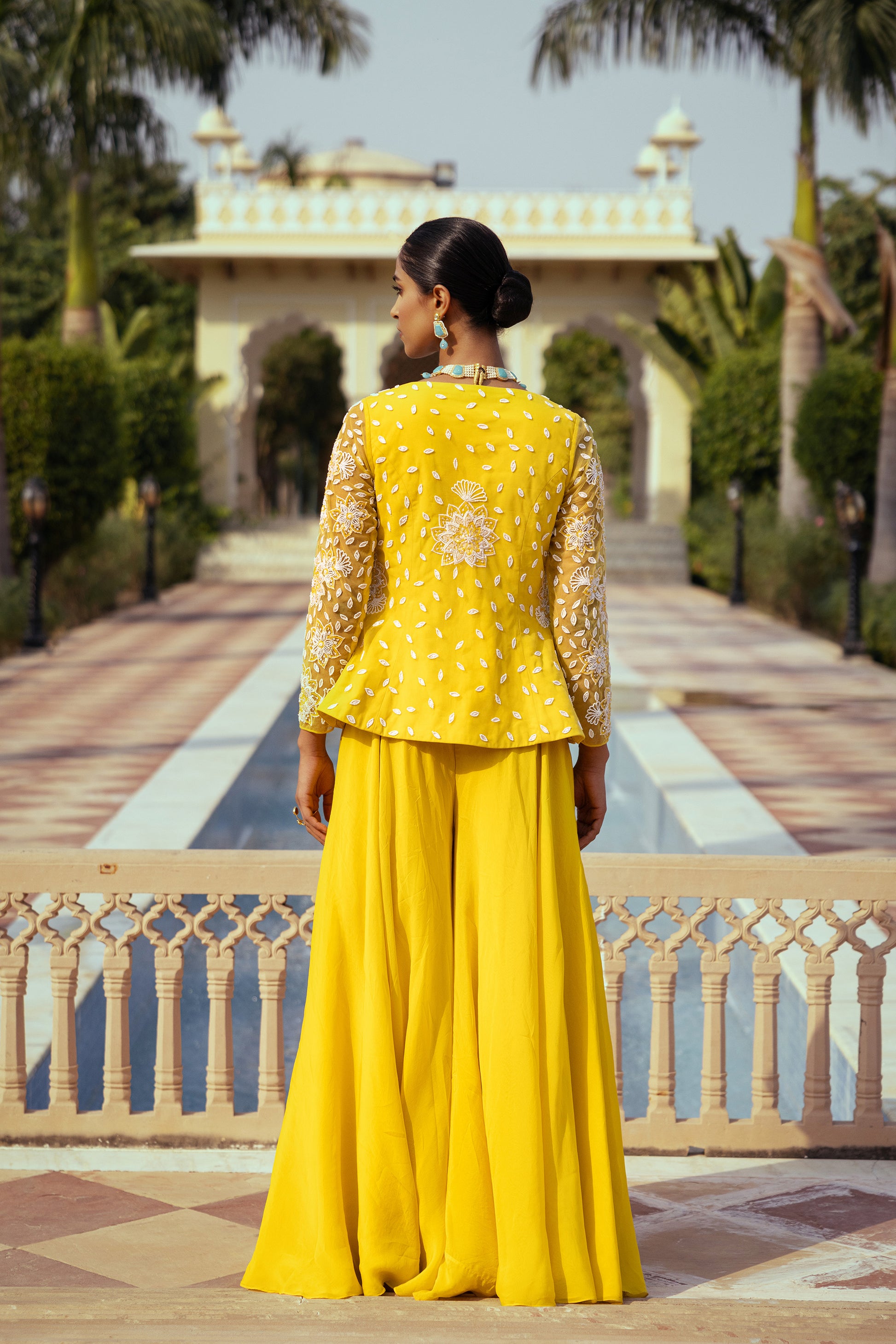 ARIA SHARARA SET - Featuring a hand embroidered jacket in net base with resham work, hand embroidered sequins, cut daana. It is paired with yellow flared organza sharara.