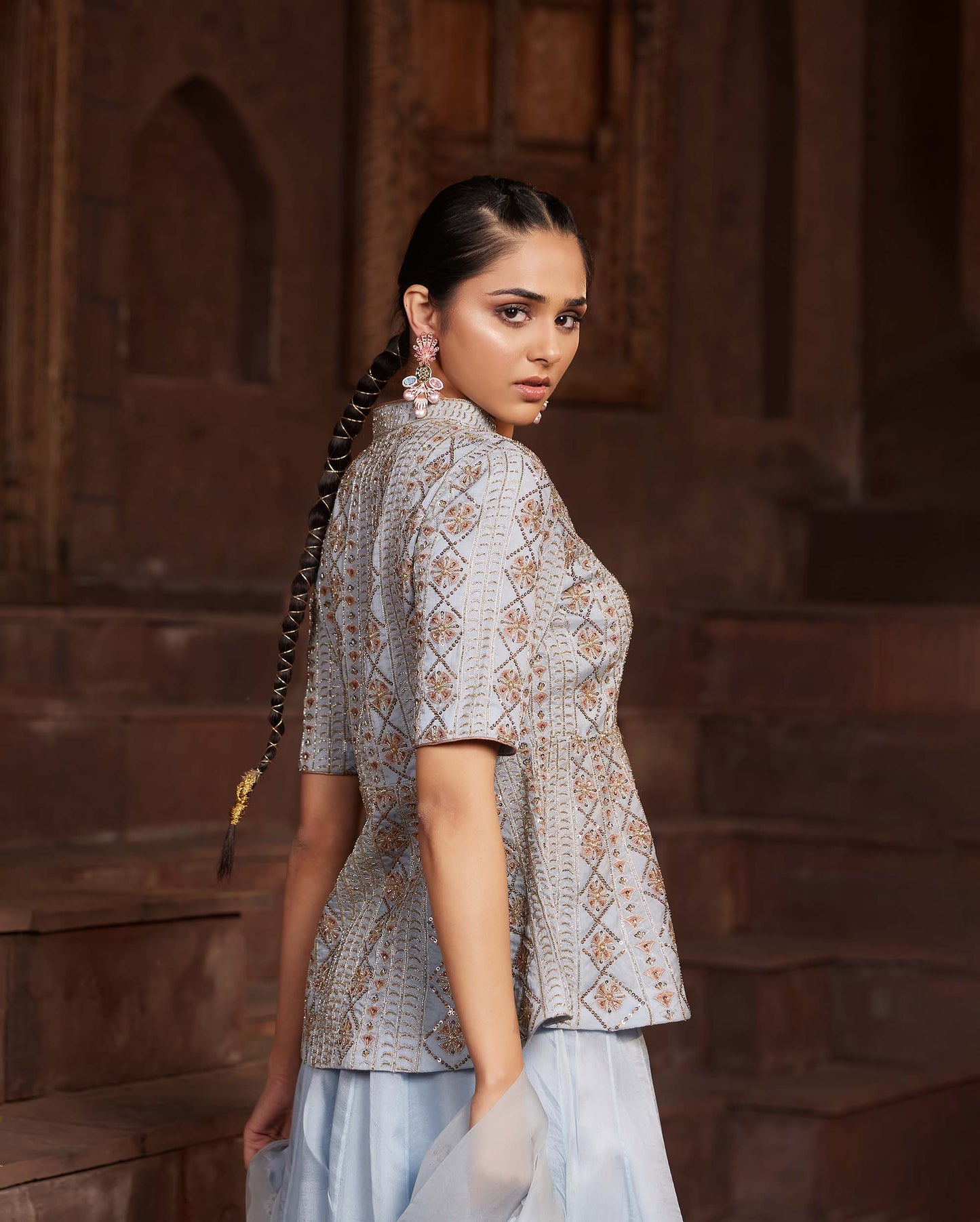 Featuring powder blue embroidered peplum kurta with matching organza sharara and organza dupatta