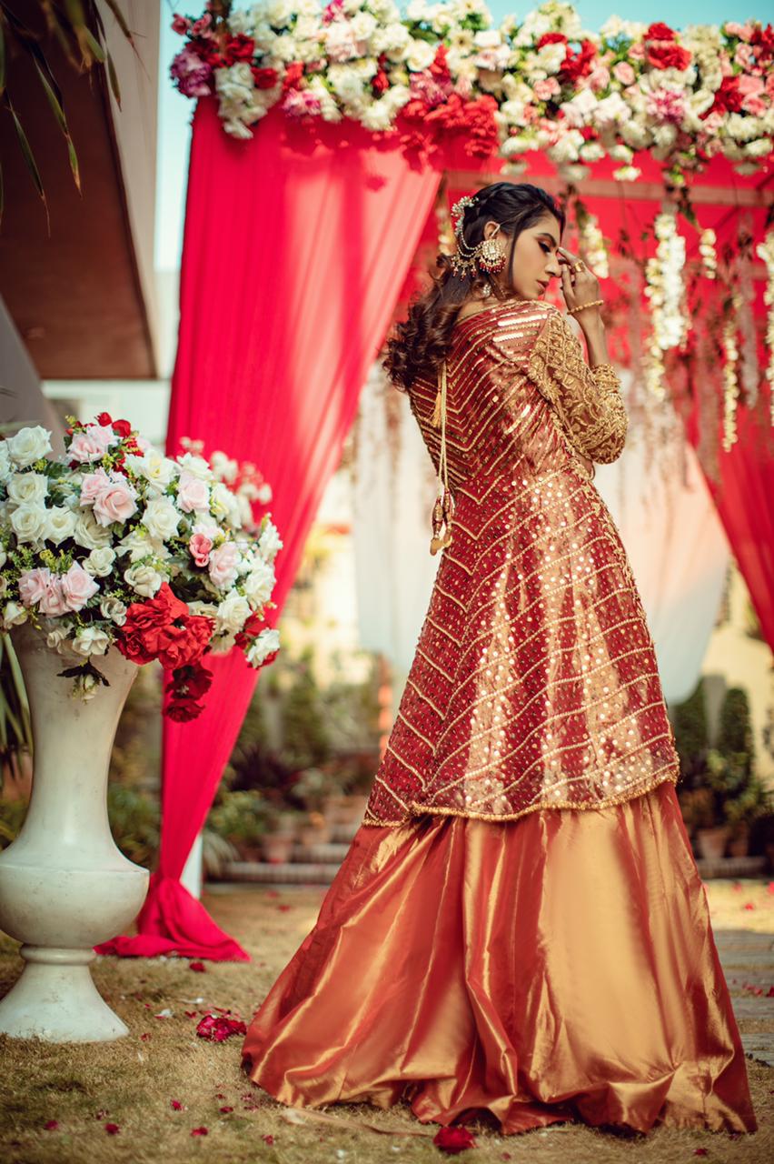 Rendered in blissful burnt red tones with delicate embroideries and embellishments, delicate and fine taankas in gold thread and Paired with a vibrant rust skirt, this feminine and flirty design is perfect for festivity. Dupatta with a heavy zardozi one side border with 3 side sequence scallope border