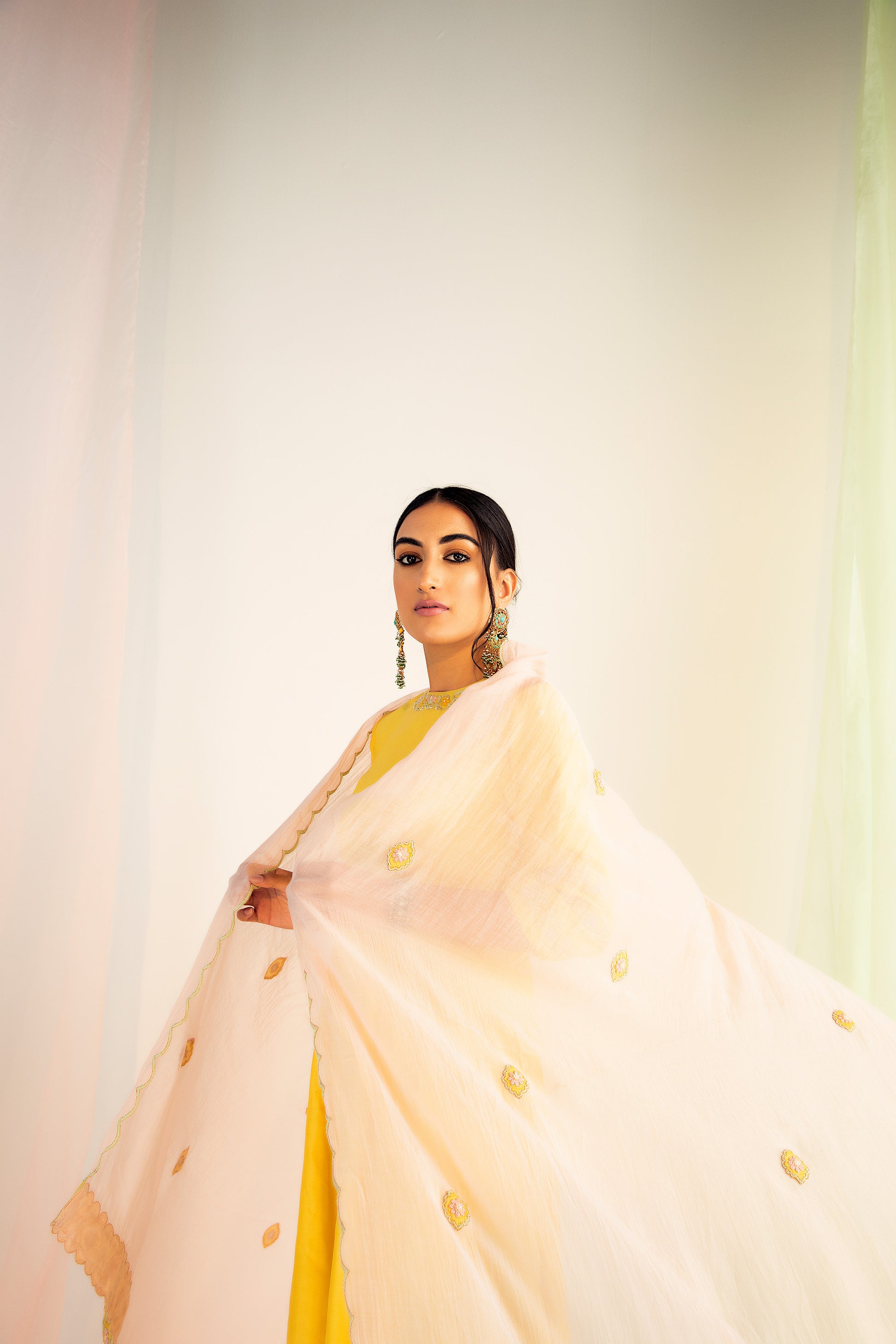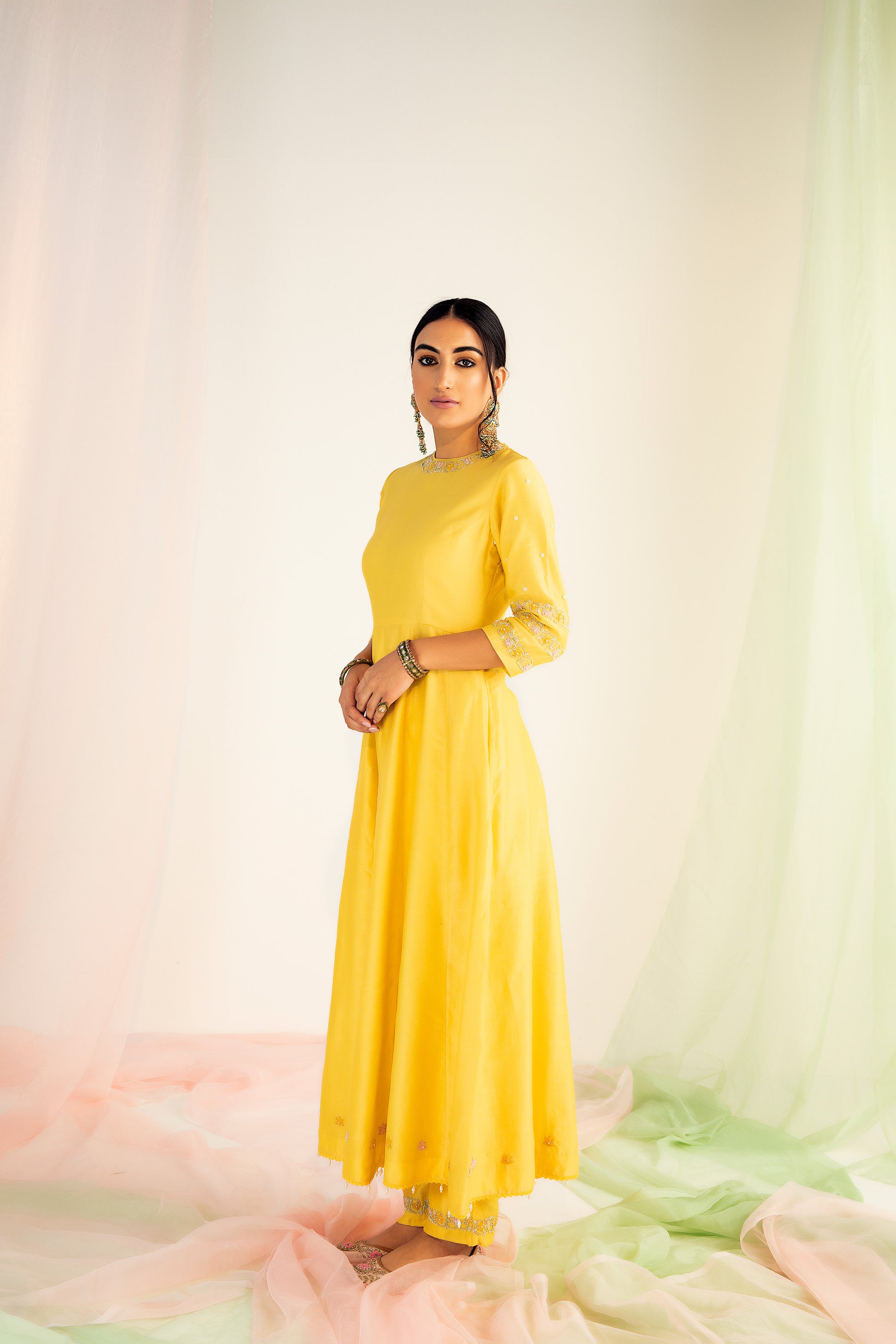 Featuring a crome yellow kalidar kurta in silk chanderi base with dori, sequins, and pearl embroidery. It is paired with matching straight pants and a silk chanderi embroidered dupatta.