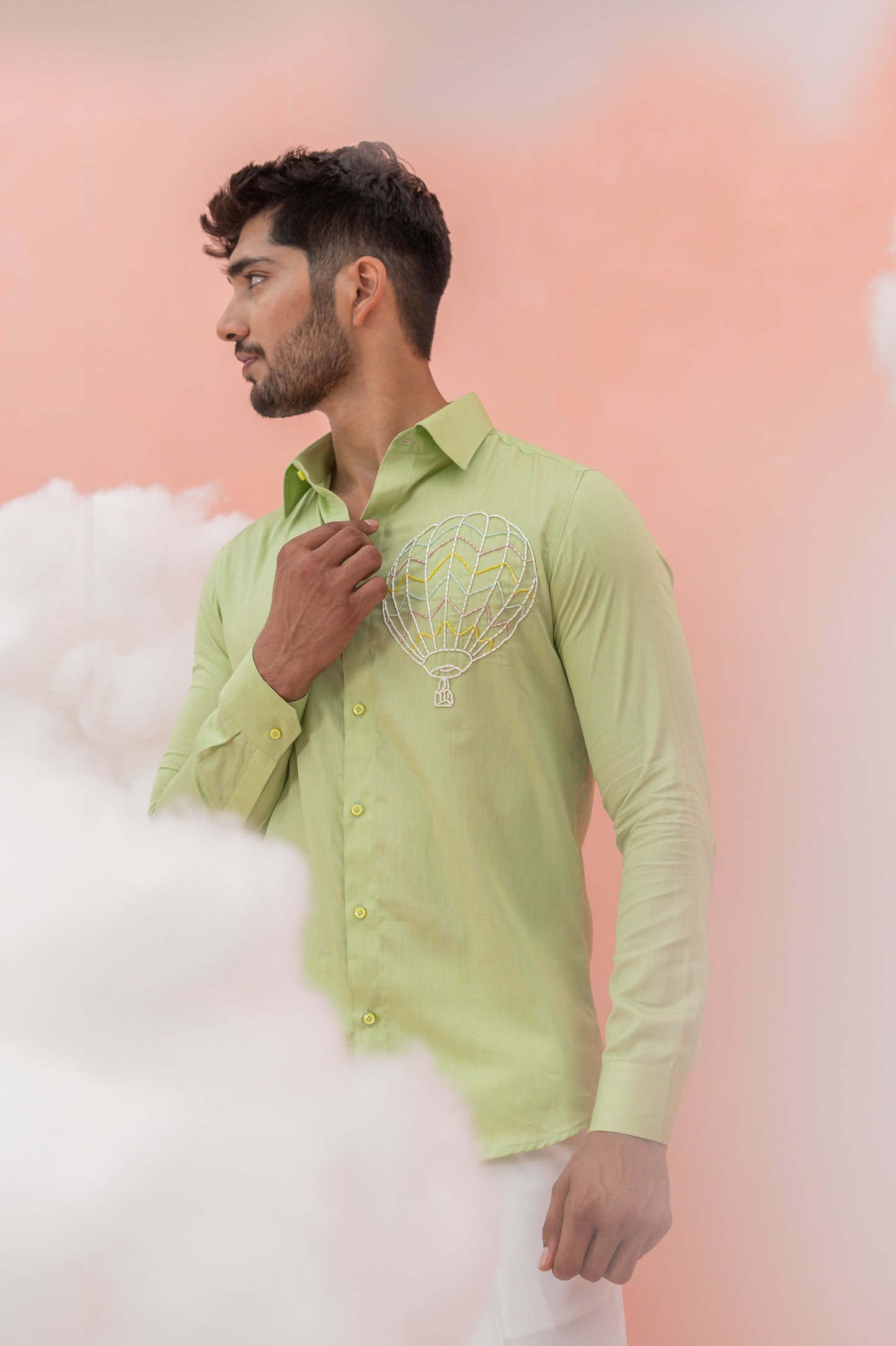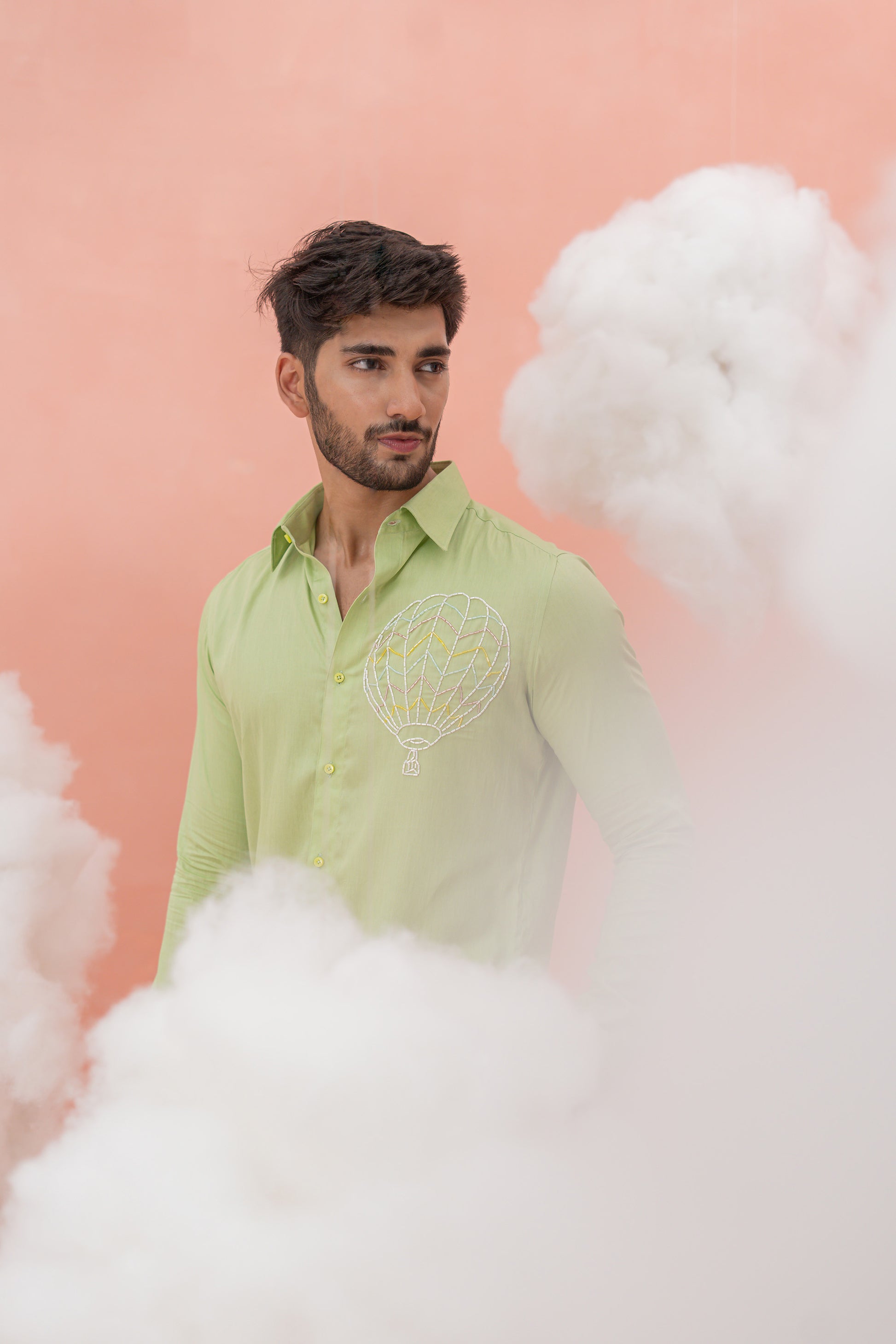 A Light Green Vegan Silk shirt, meticulously hand-embroidered with cut pipes in white, blue, pink, and yellow, forming a vibrant hot air balloon. This design captures the fresh and exhilarating vibes of summer, blending formal elegance with a playful after-party spirit. Perfect for those who want to infuse their wardrobe with a touch of adventure while maintaining a polished look.