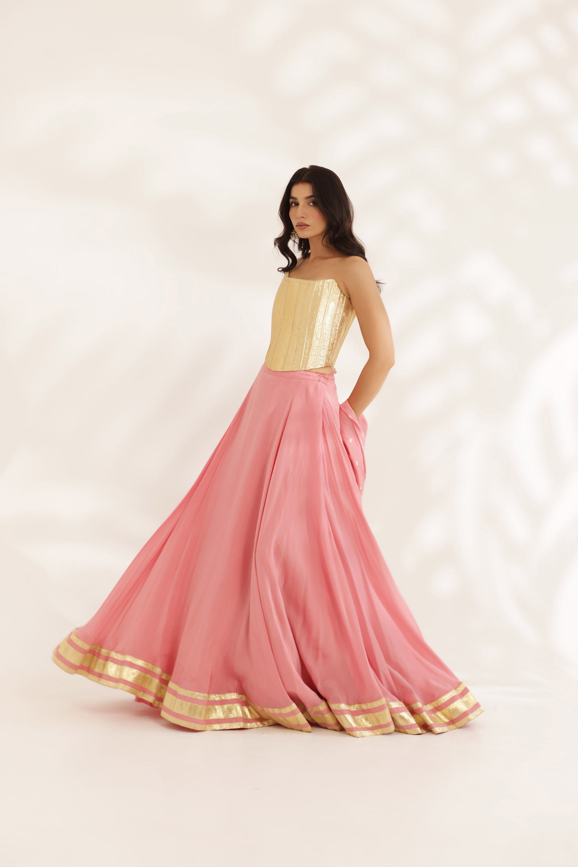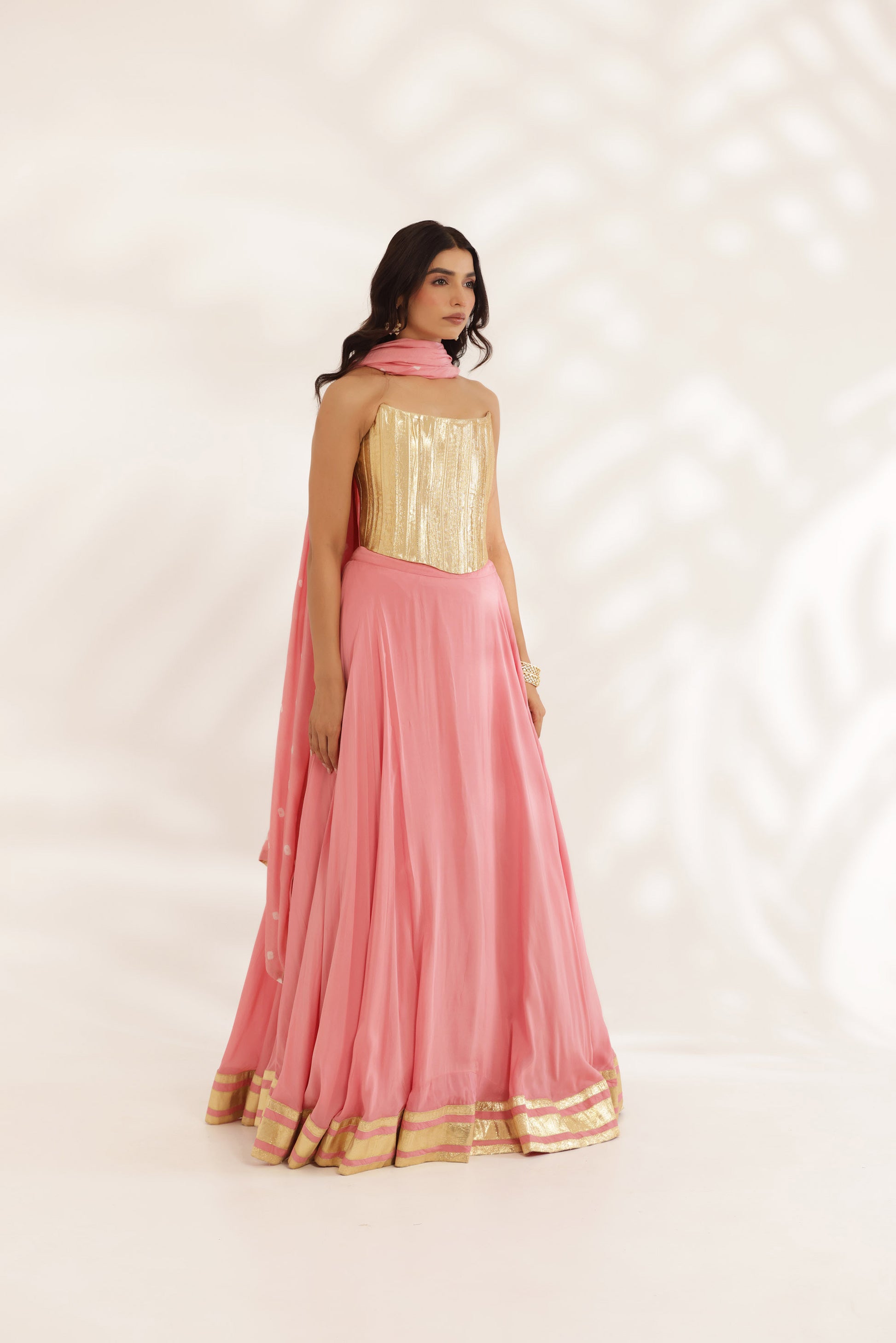 Natural crepe lehenga with gotta border on flare paired with the gotta corset and bandhani silk dupatta