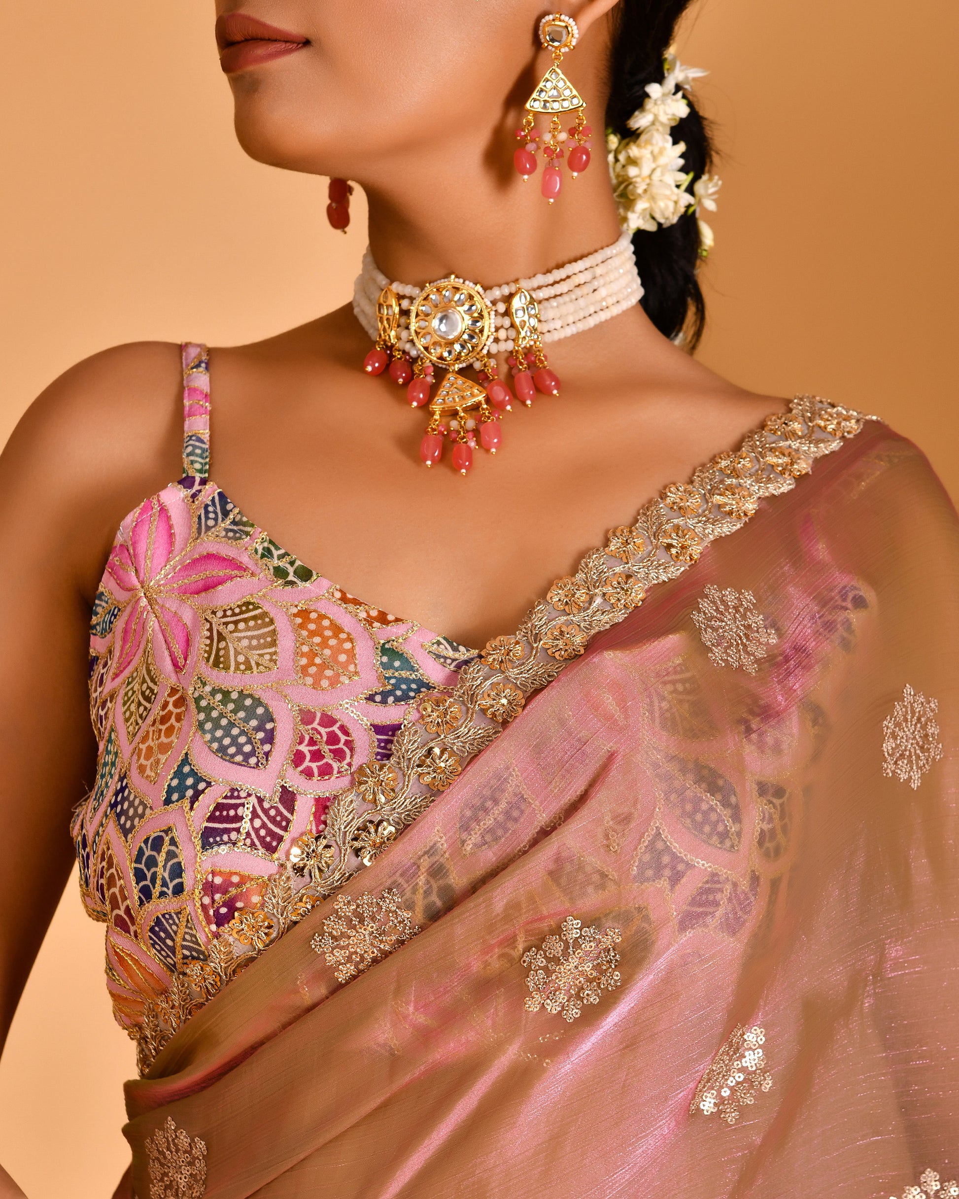 Made with delicate tissue organza, this saree features intricate sequence work and lace details for a touch of glamour. Comes with a beautifully crafted blouse adorned with sequence work.