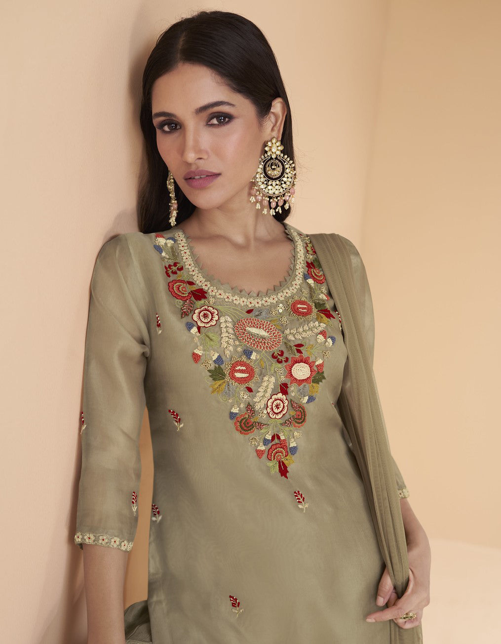 Are you seeking something exclusive? We've got what you require! This Beige Color Embroidered Organza Sharara with its gorgeous thread embroidery and beige color is the perfect option for those seeking to make an impact. You will certainly be the center of attention in this Sharara if you wear it to a Eid, wedding reception, an engagement party, or a sangeet. Pictured here is a guest wearing the Beige Color Embroidered Organza Sharara which you can purchase today!