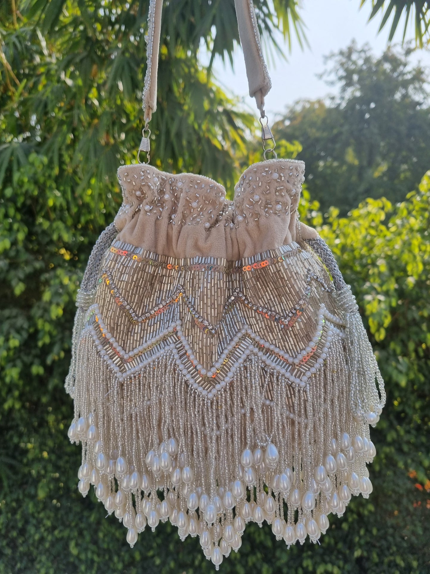 Hand embroidered Velvet Potli Bag Embellished with Silver Beads and Pearl Tassels on both sides. Comes with a Hand embroidered Velvet handle and handmade Latkans on the sides