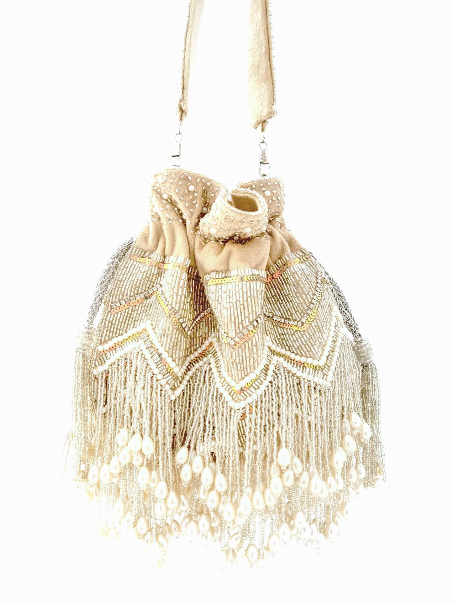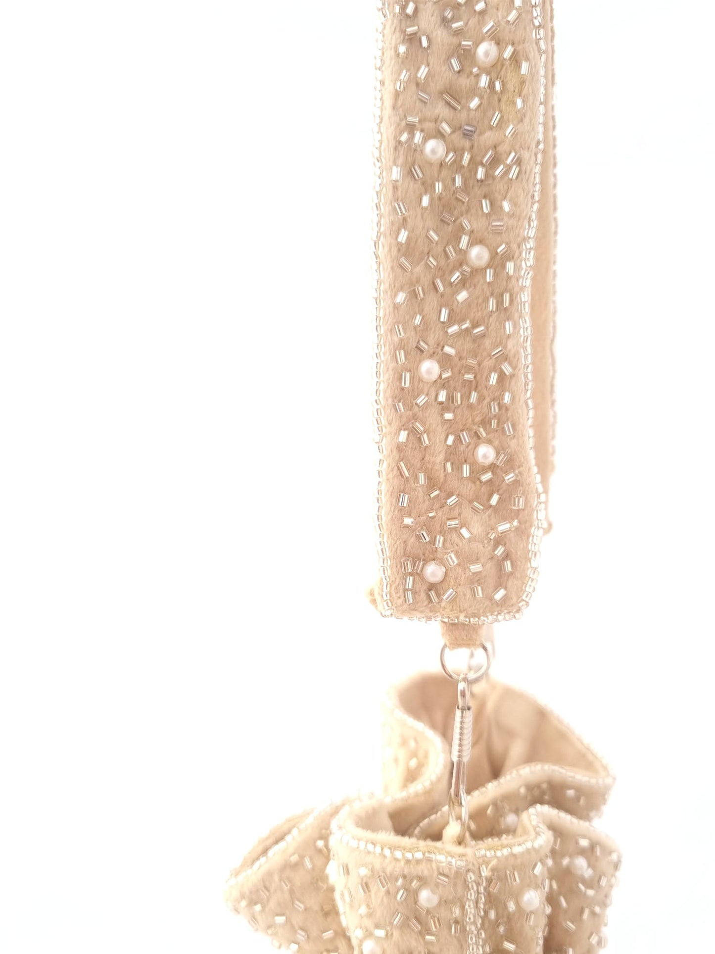 Beige Embellished Velvet Cut Dana Pearl Tasseled Potli
