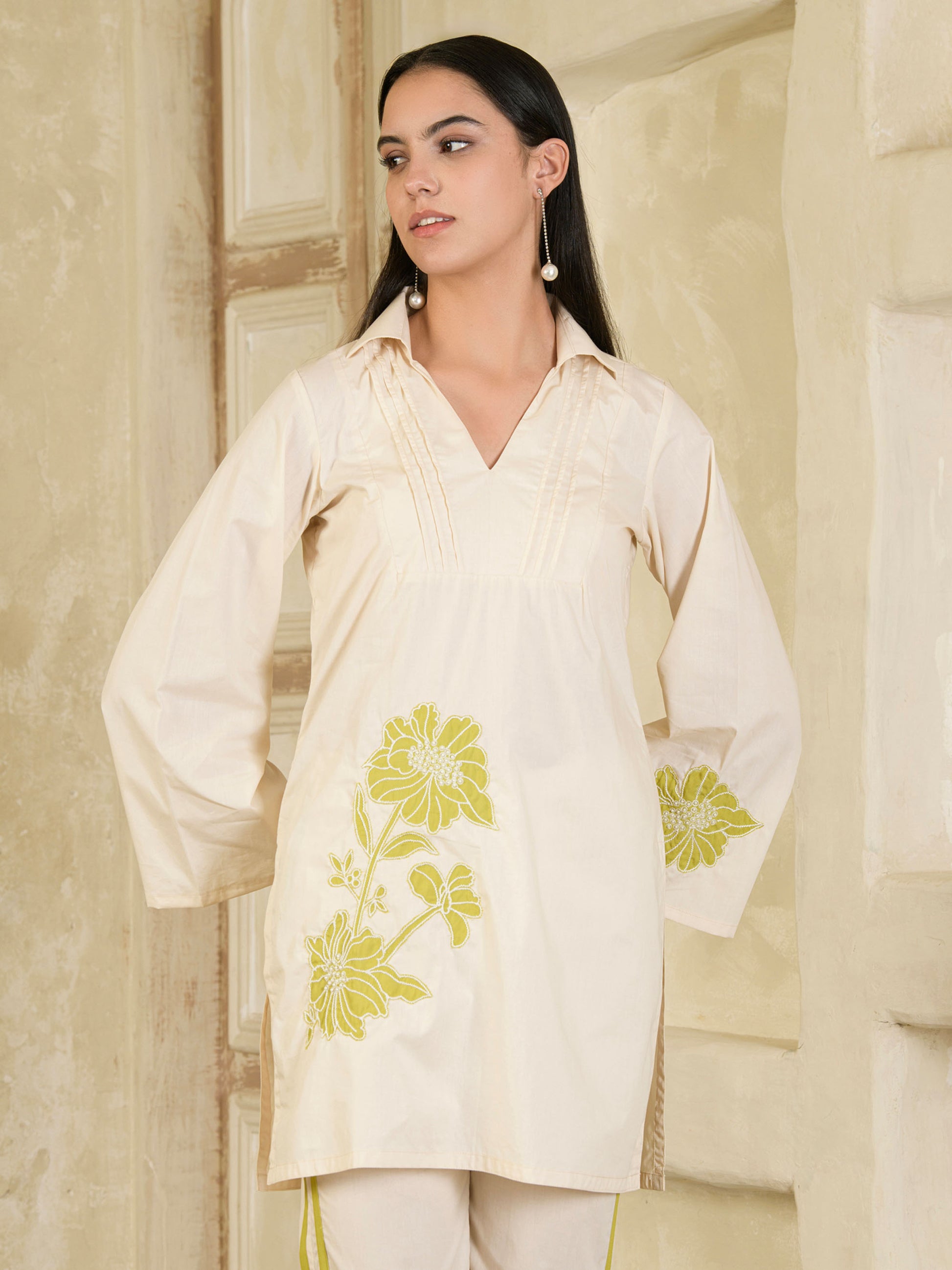 Refined and elegant, this Beige cotton co-ord set features intricate hand-embroidered patchwork detailing in fresh lime tones. The kurta is styled with a pleated neckline, flared sleeves, and floral embroidery that adds artisanal charm. Paired with straight pants accented by matching patch lines, this set is perfect for effortless daytime sophistication.