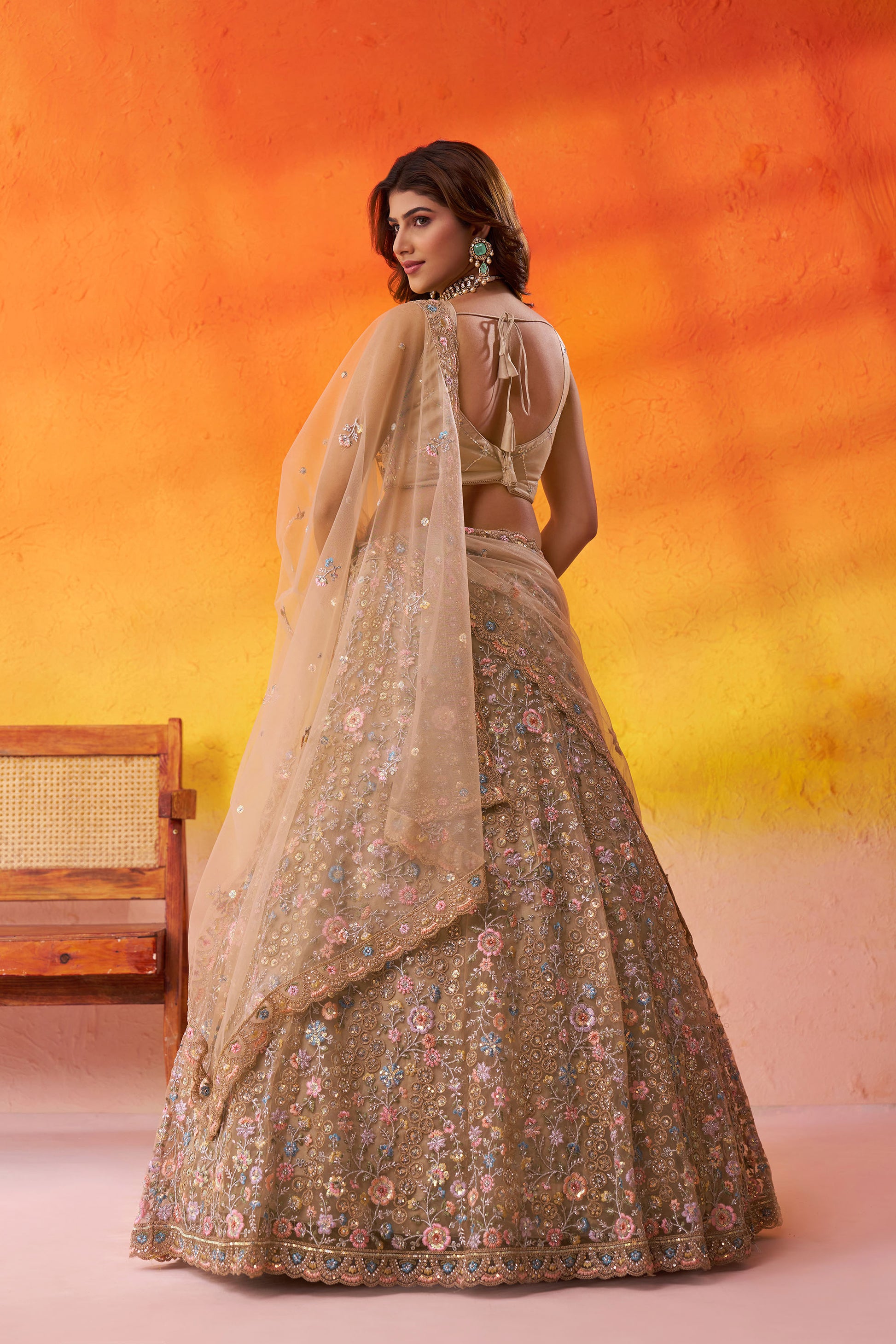 Beige Net Heavy Sequins & Floral Embroidery Bridal Lehenga