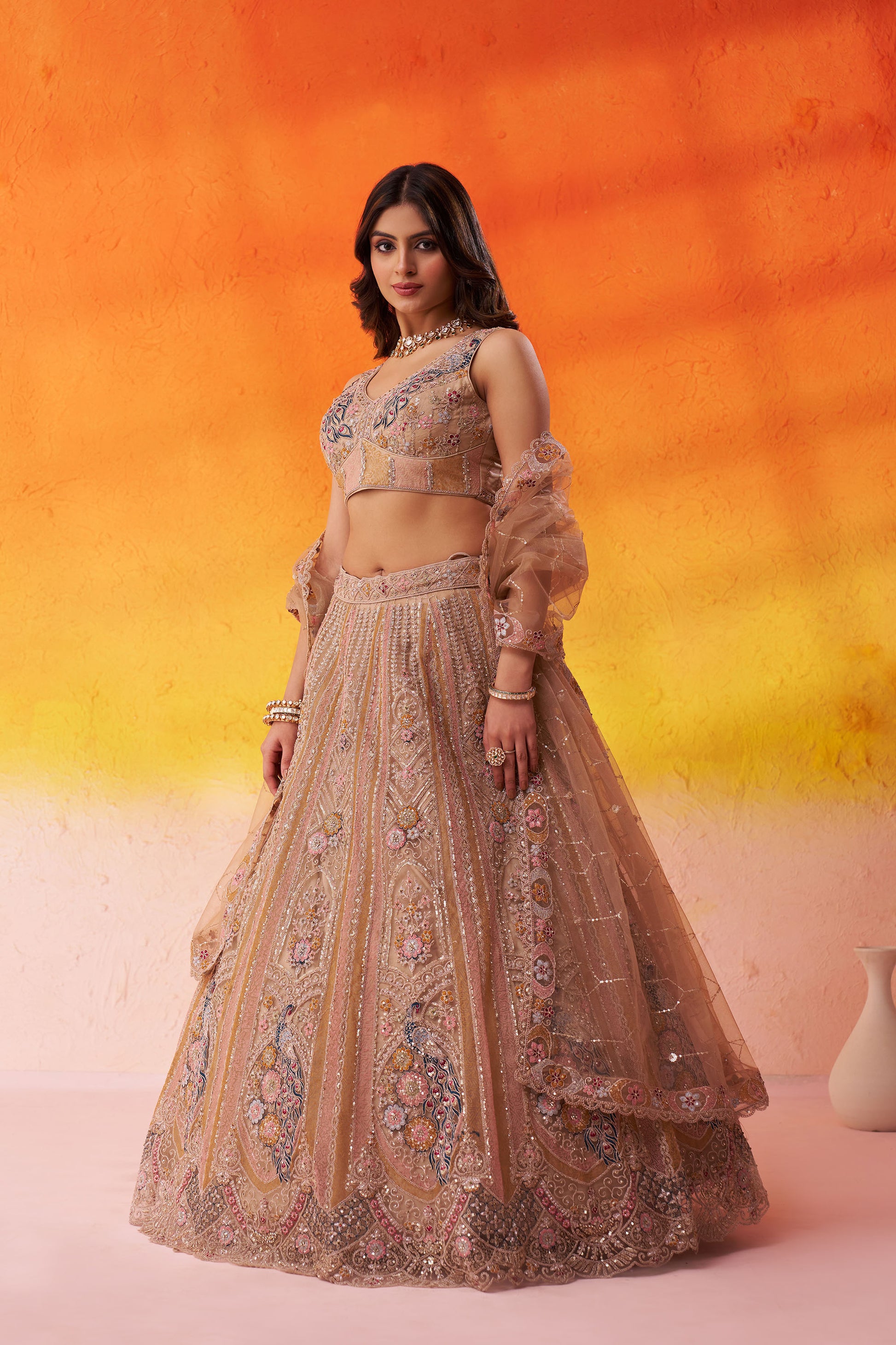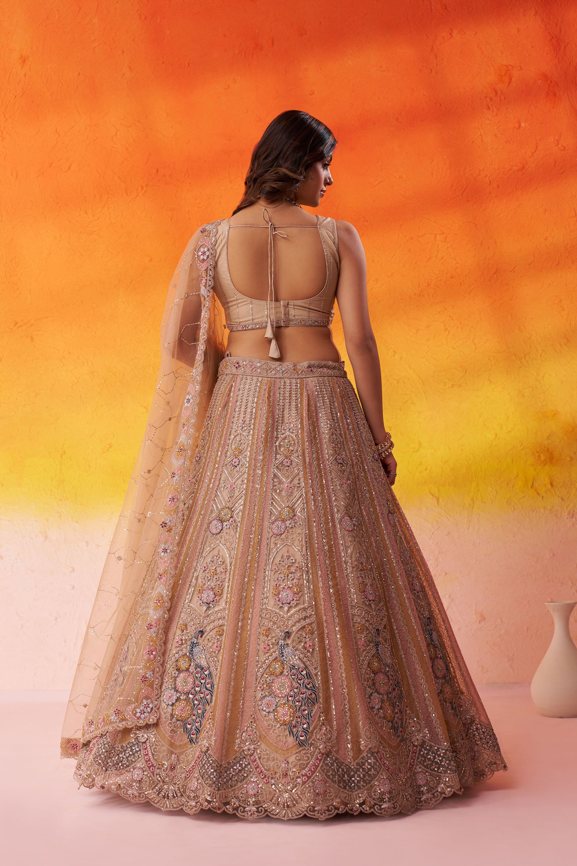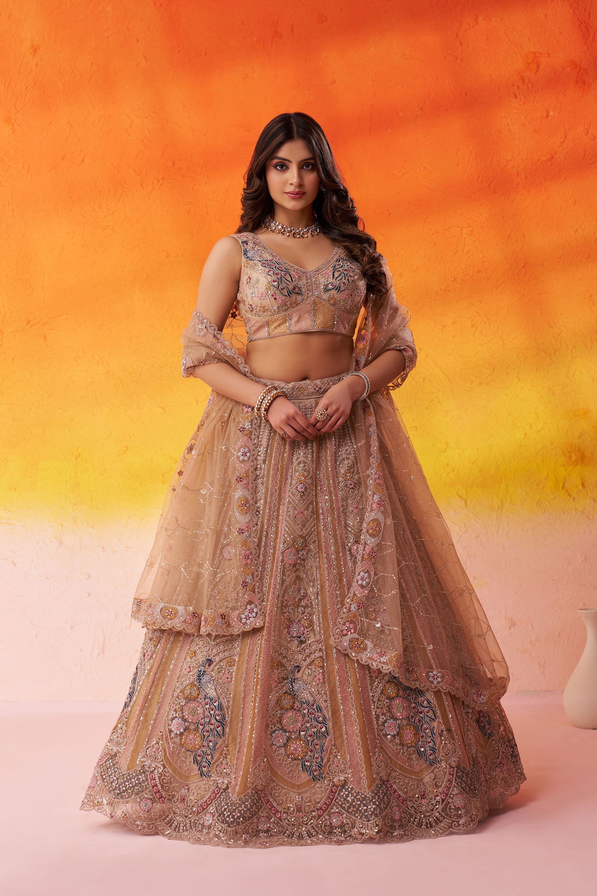 Beige Net Heavy Sequins & Peacock Embroidery Bridesmaid Lehenga