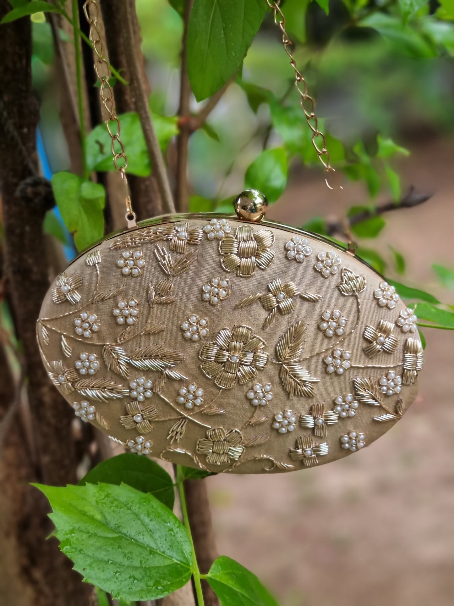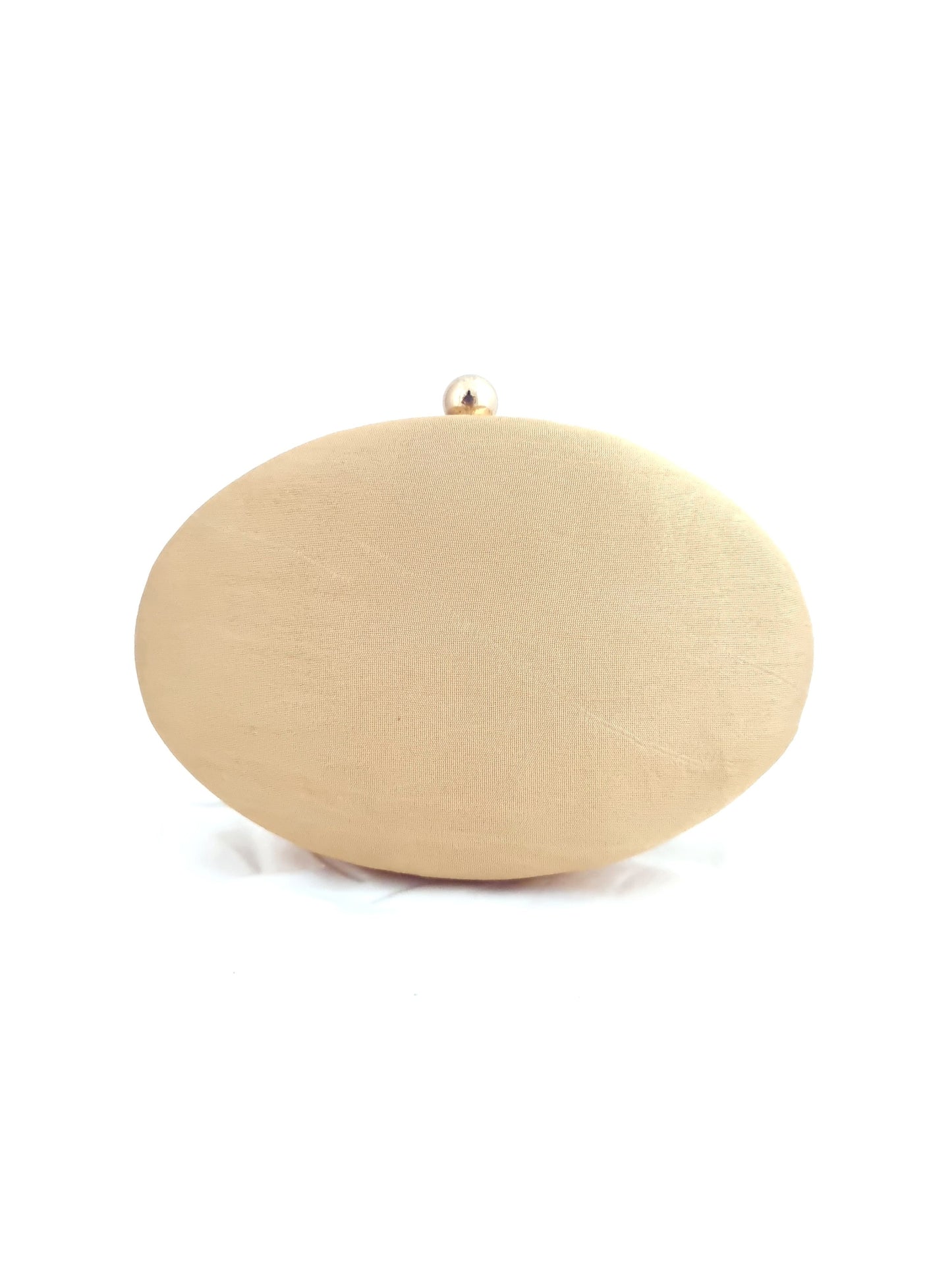Beige Oval Dabka Hand Embroidered Clutch