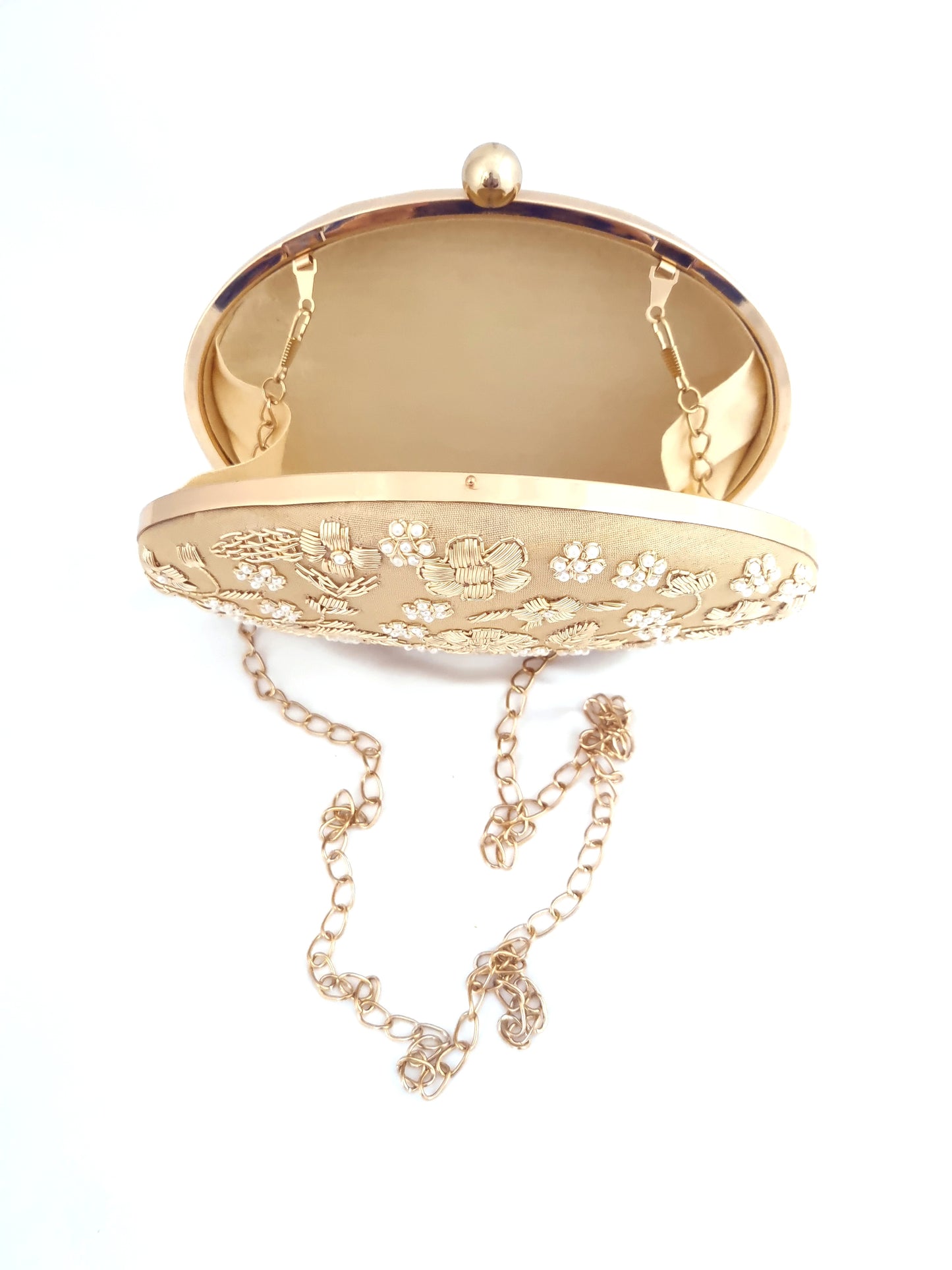 Hand embroidered Clutch with Gold Dabka work in Floral Pattern on one side. The Back side is Premium Silk Fabric. The Clutch comes with a long Sling Chain