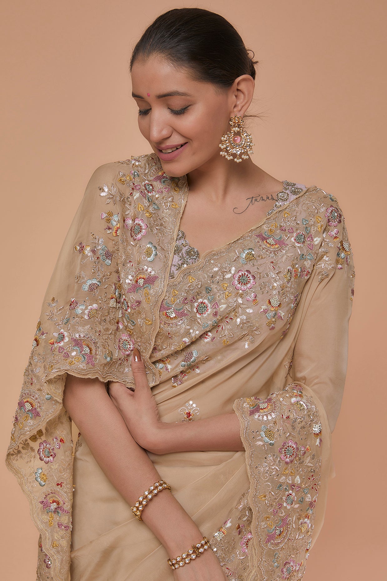 Featuring A Beige Saree In Pure Organza Base With Hand Embroidery. It Is Paired With A Matching Unstitched Blouse Piece.