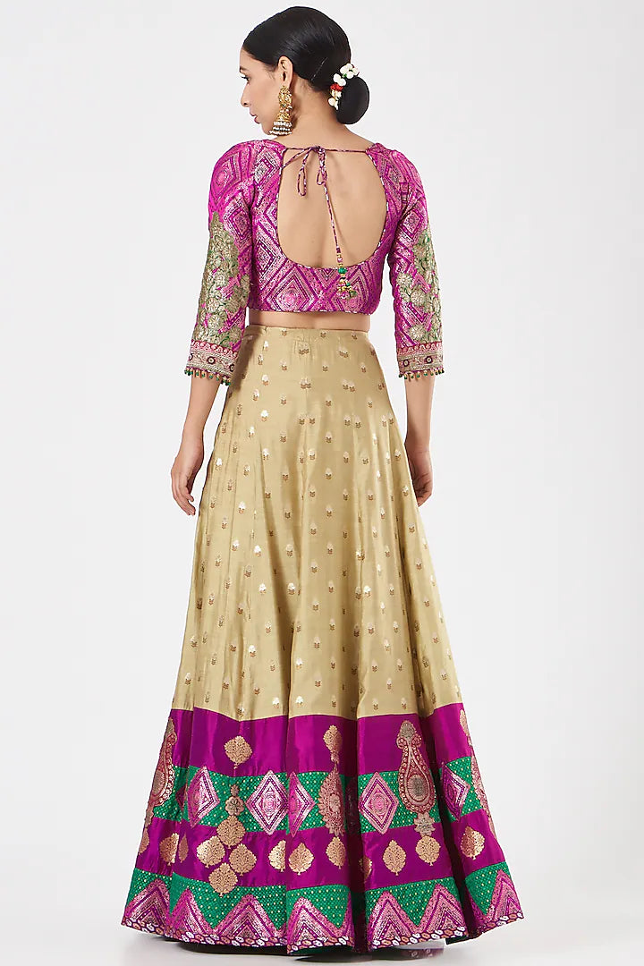 Featuring a beige lehenga in pure silk base with multi-colored pure brocade borders. It is paired with a contrasting fuschia pink brocade blouse and an organza dupatta having applique embroidery.