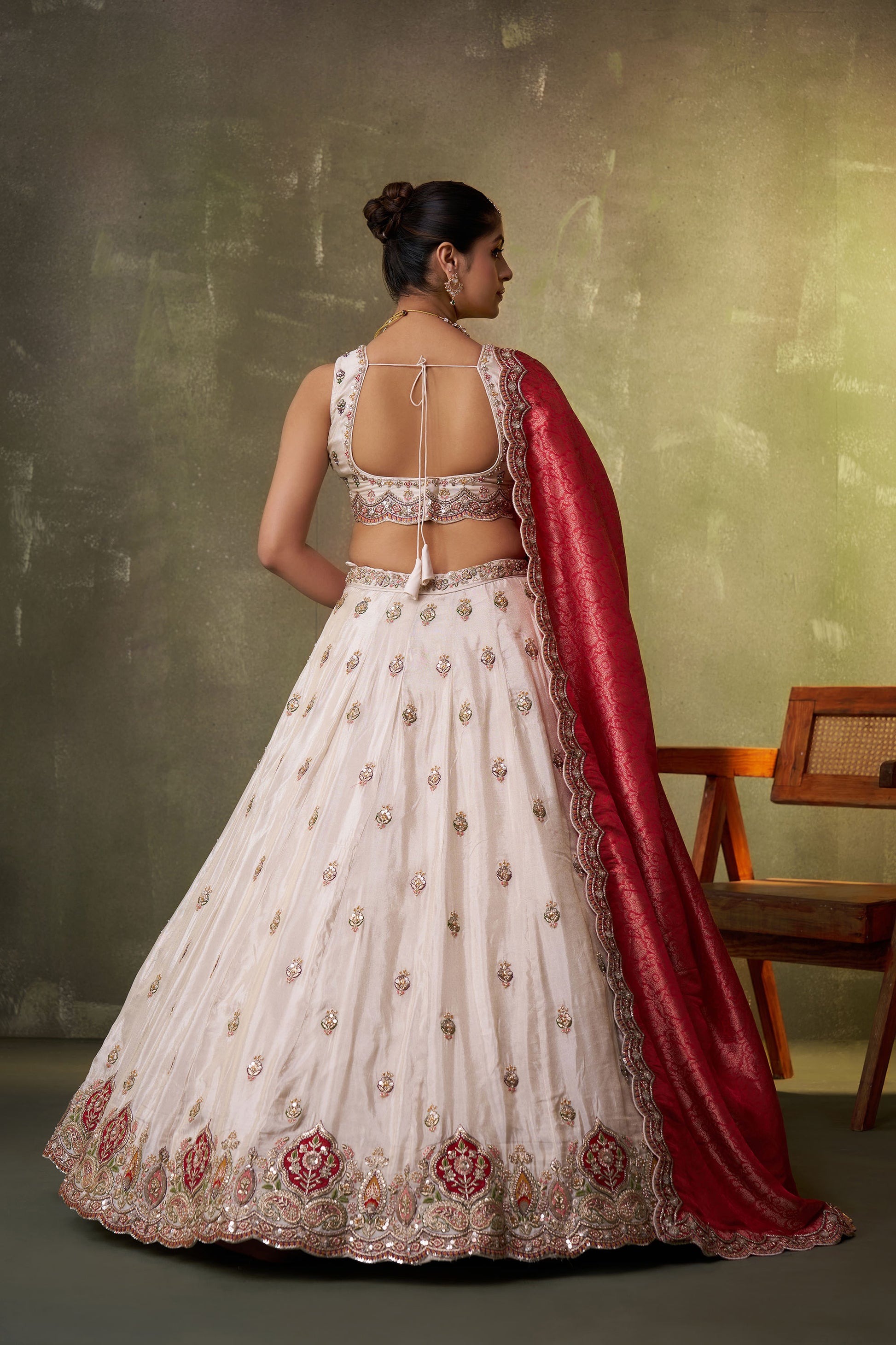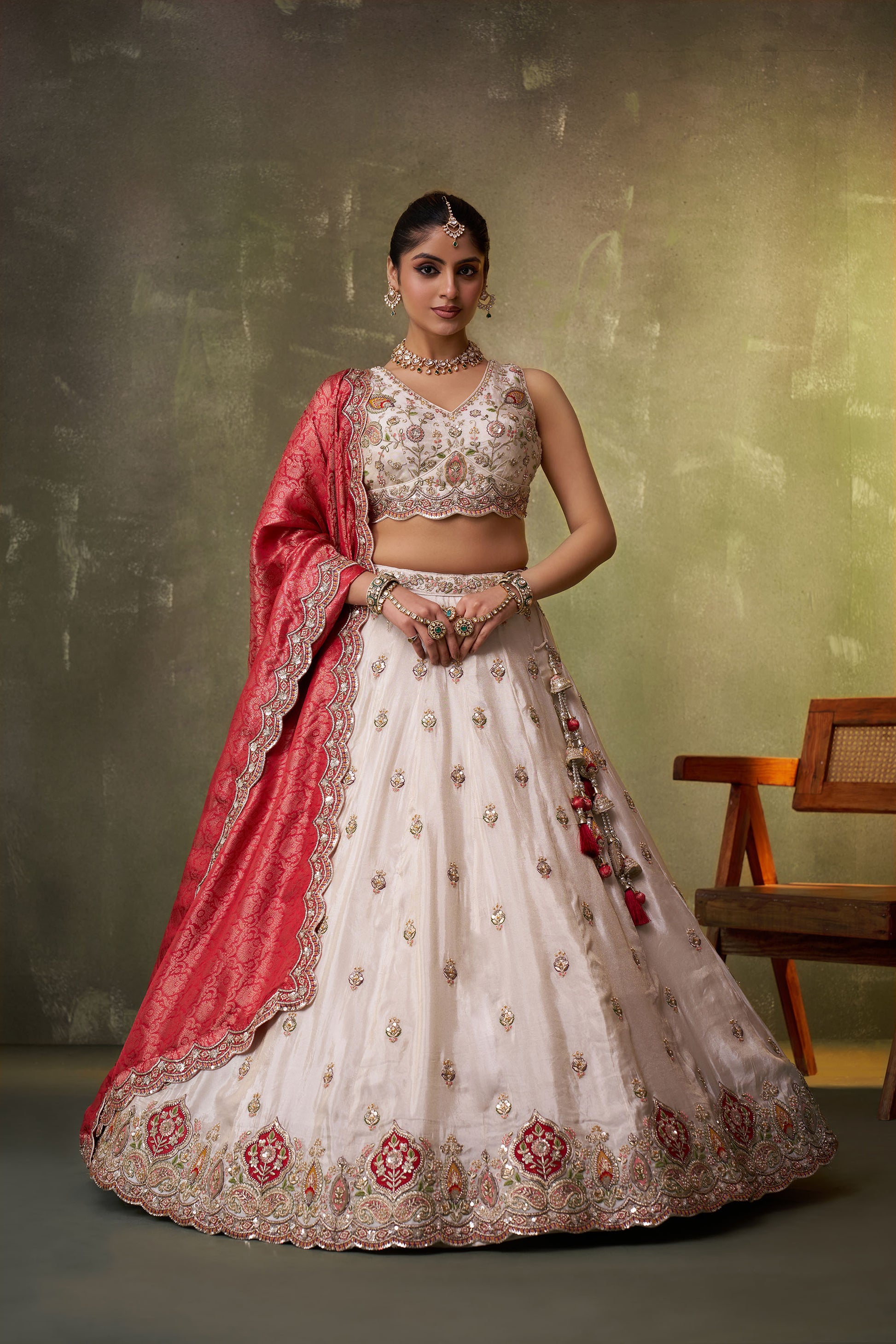 Beige Tissue Sequins, Thread & Embroidery Lehenga With Red Dupatta for Engagement