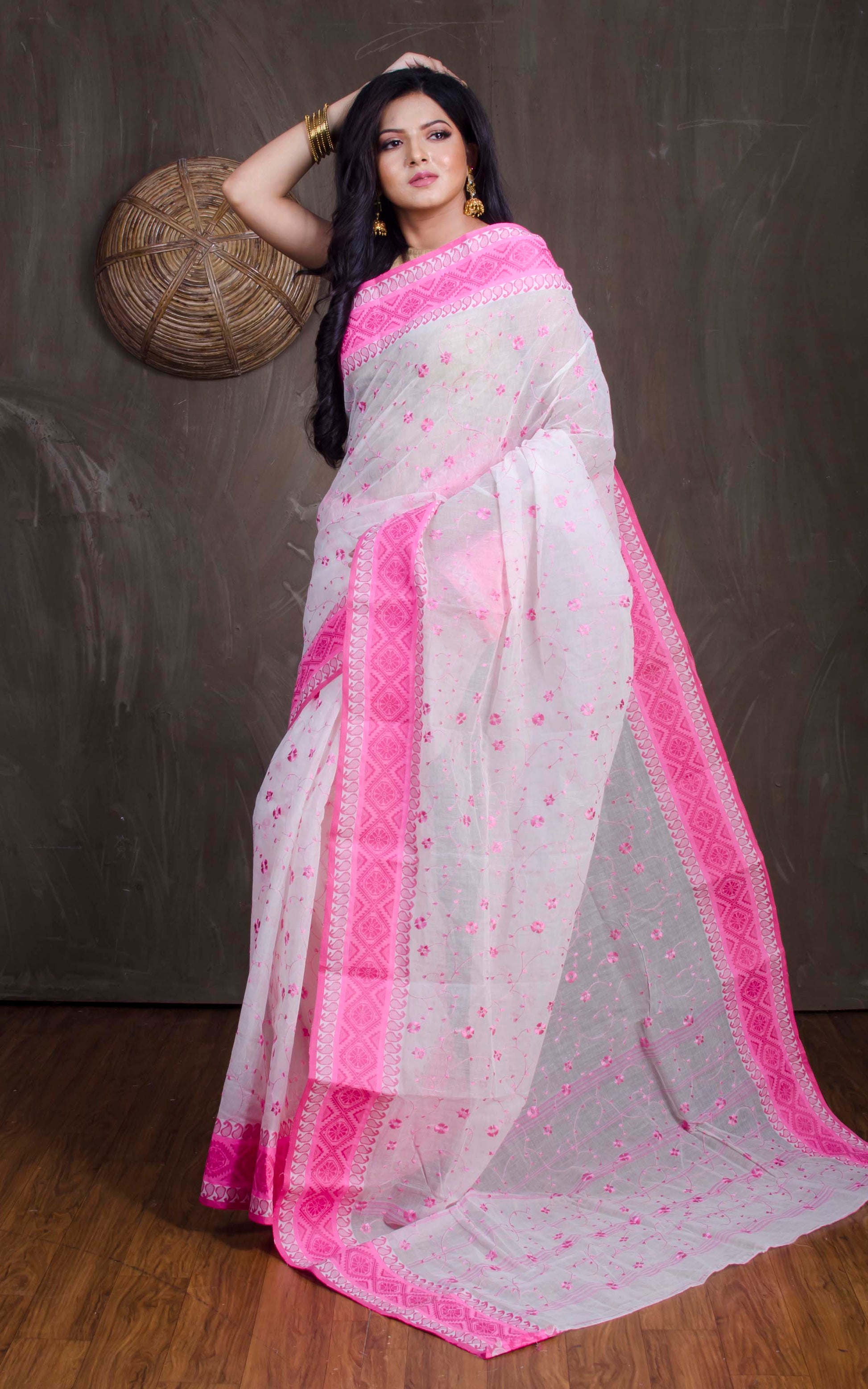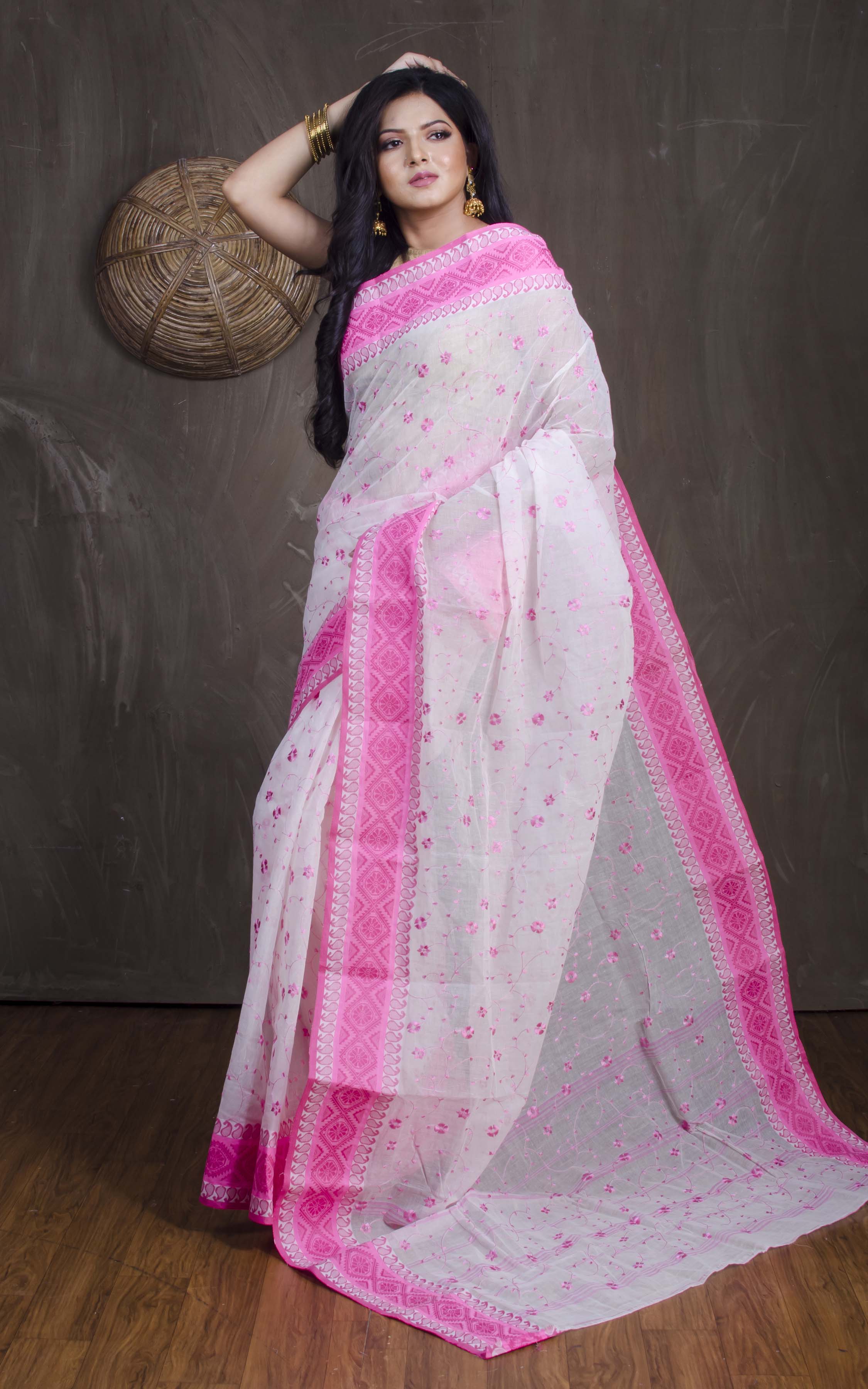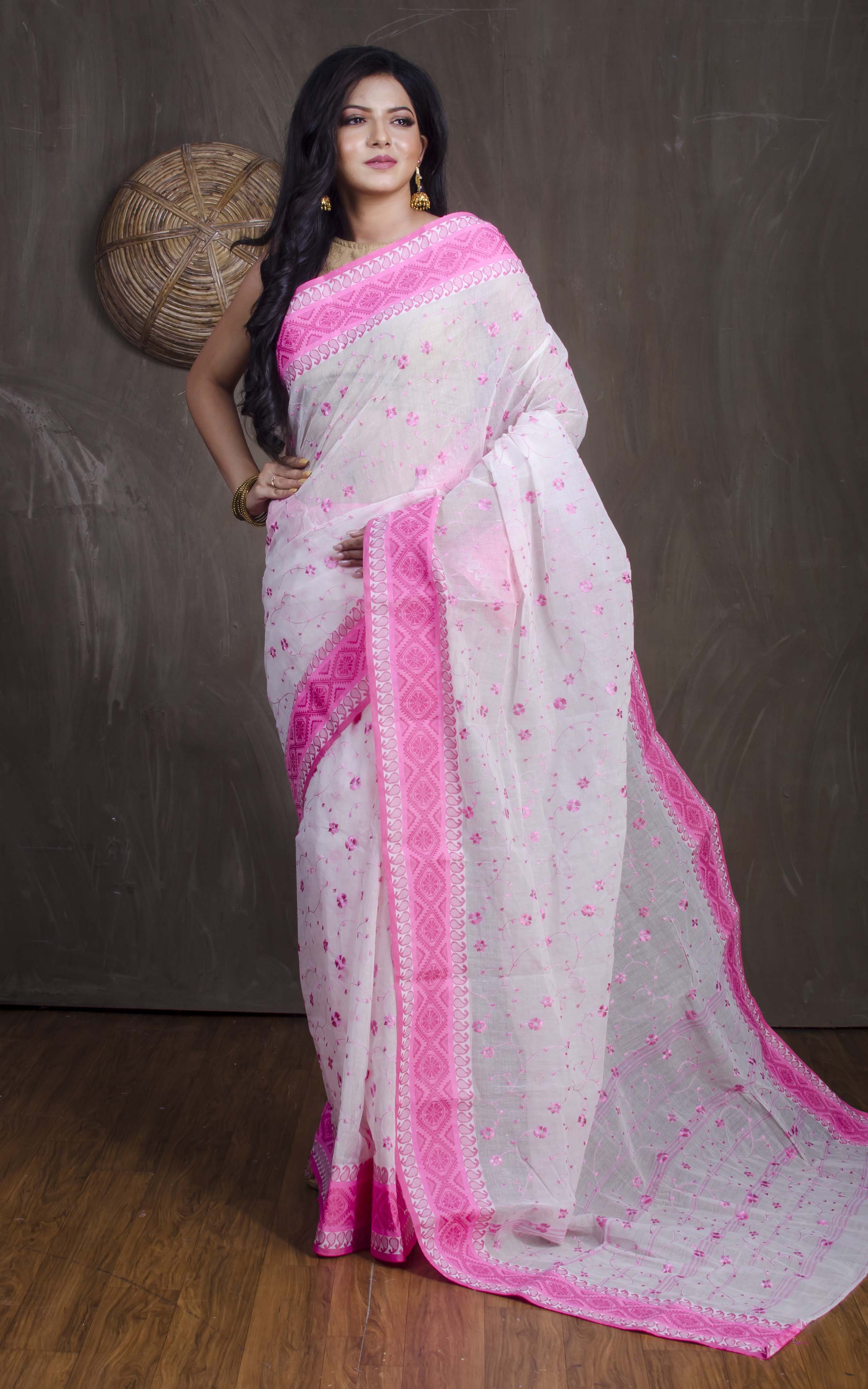 Bengal Handloom Cotton Saree with Floral Jaal Embroidery Work in White and Pink