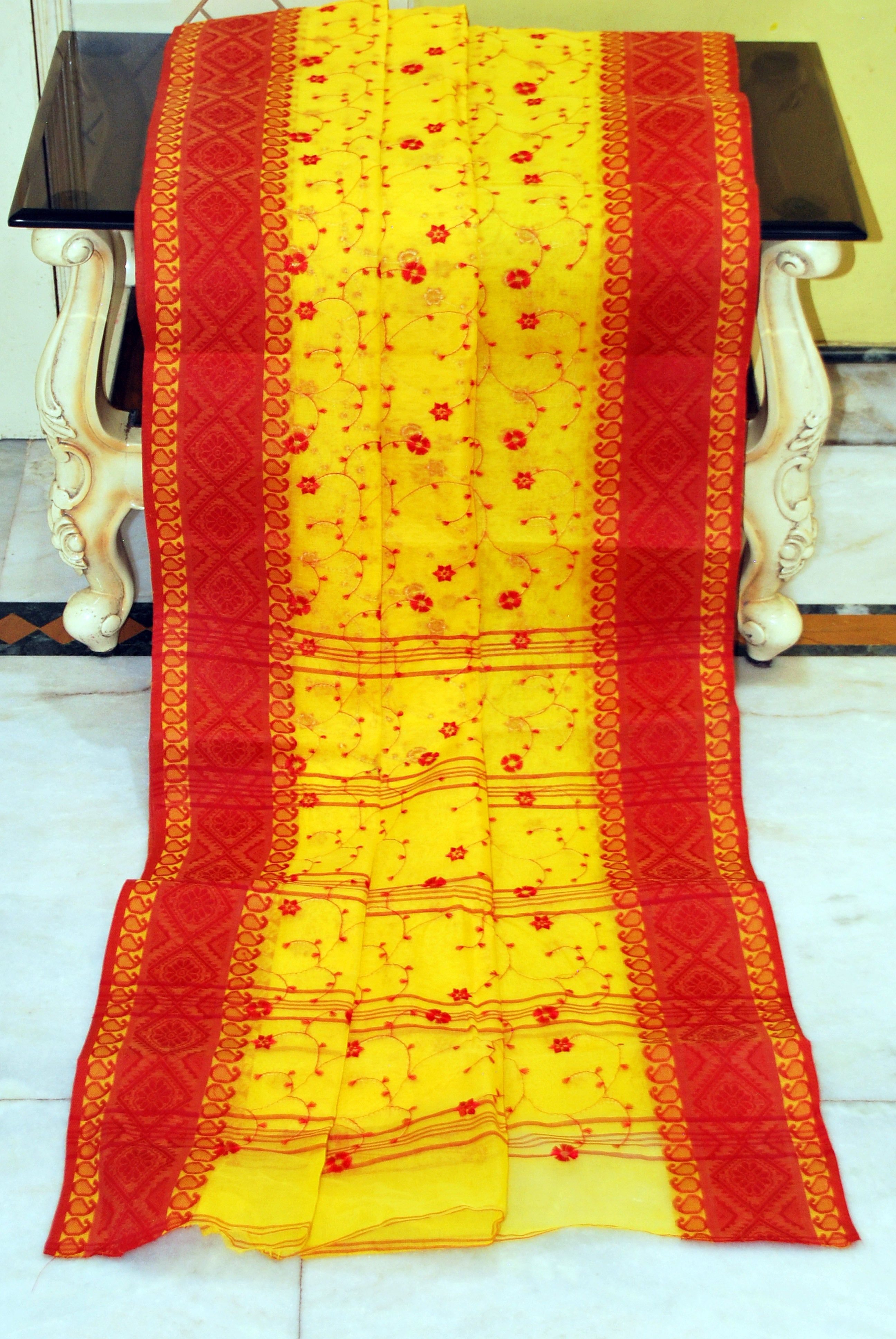 Bengal Handloom Cotton Saree with Floral Jaal Embroidery Work in Yellow and Red