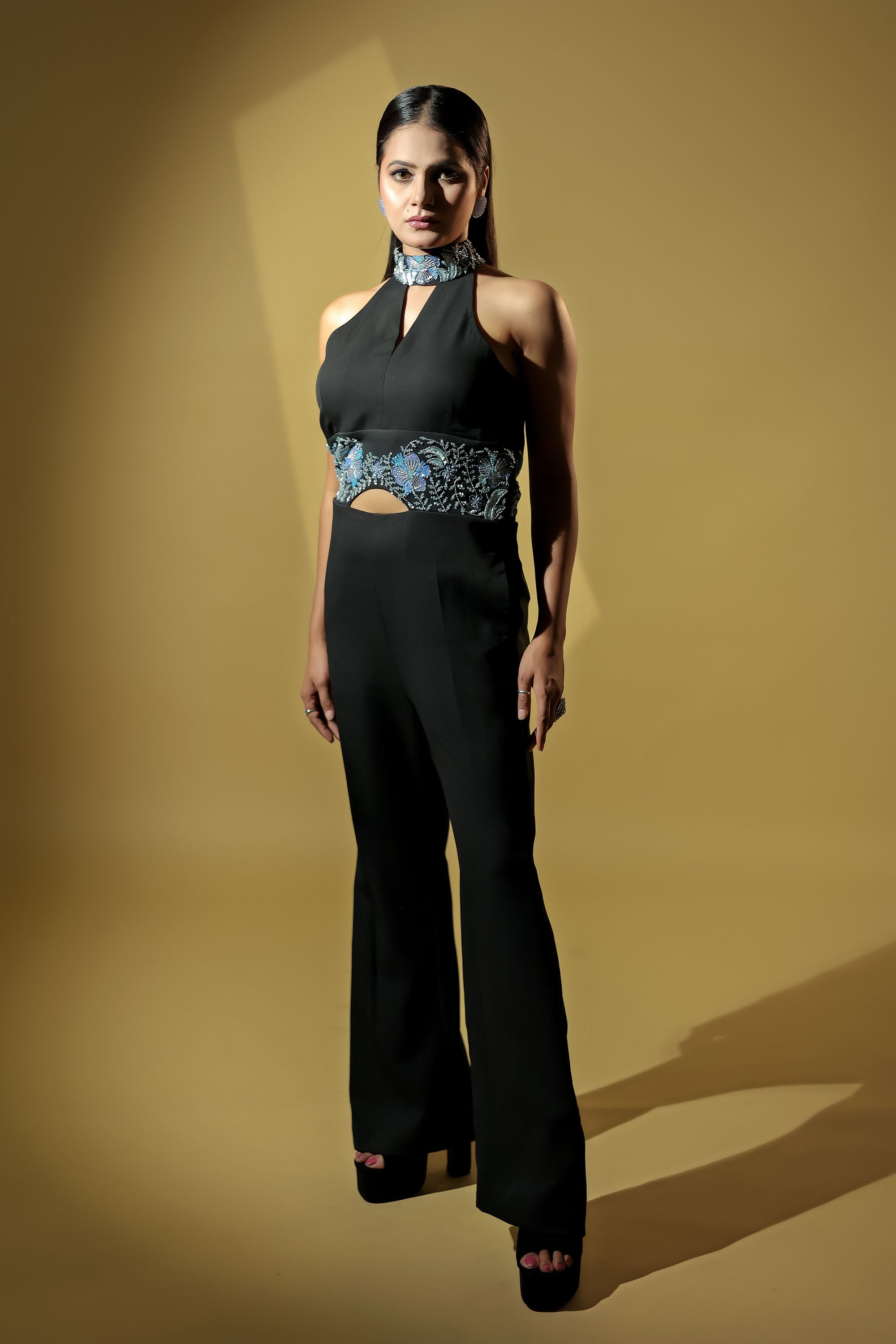 Black Chic and Stylish Halter Neck Jumpsuit With Embellished Waist Line