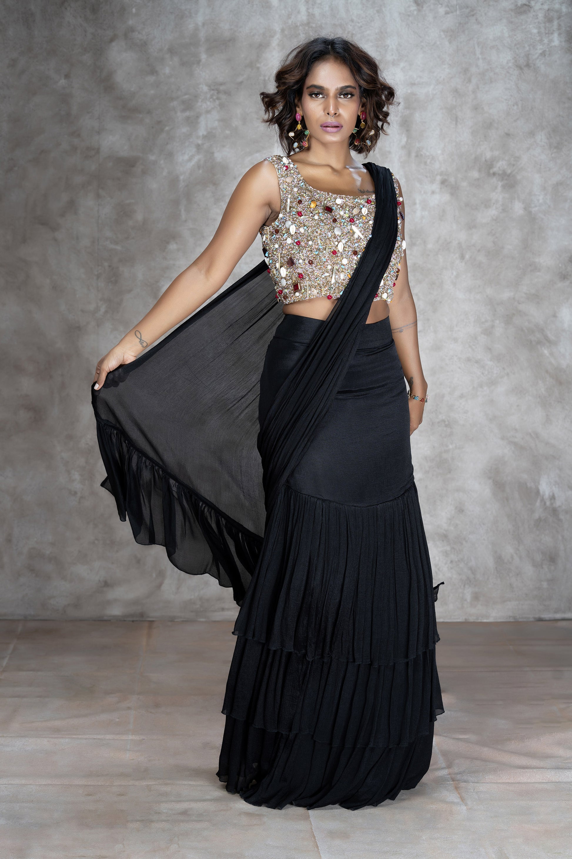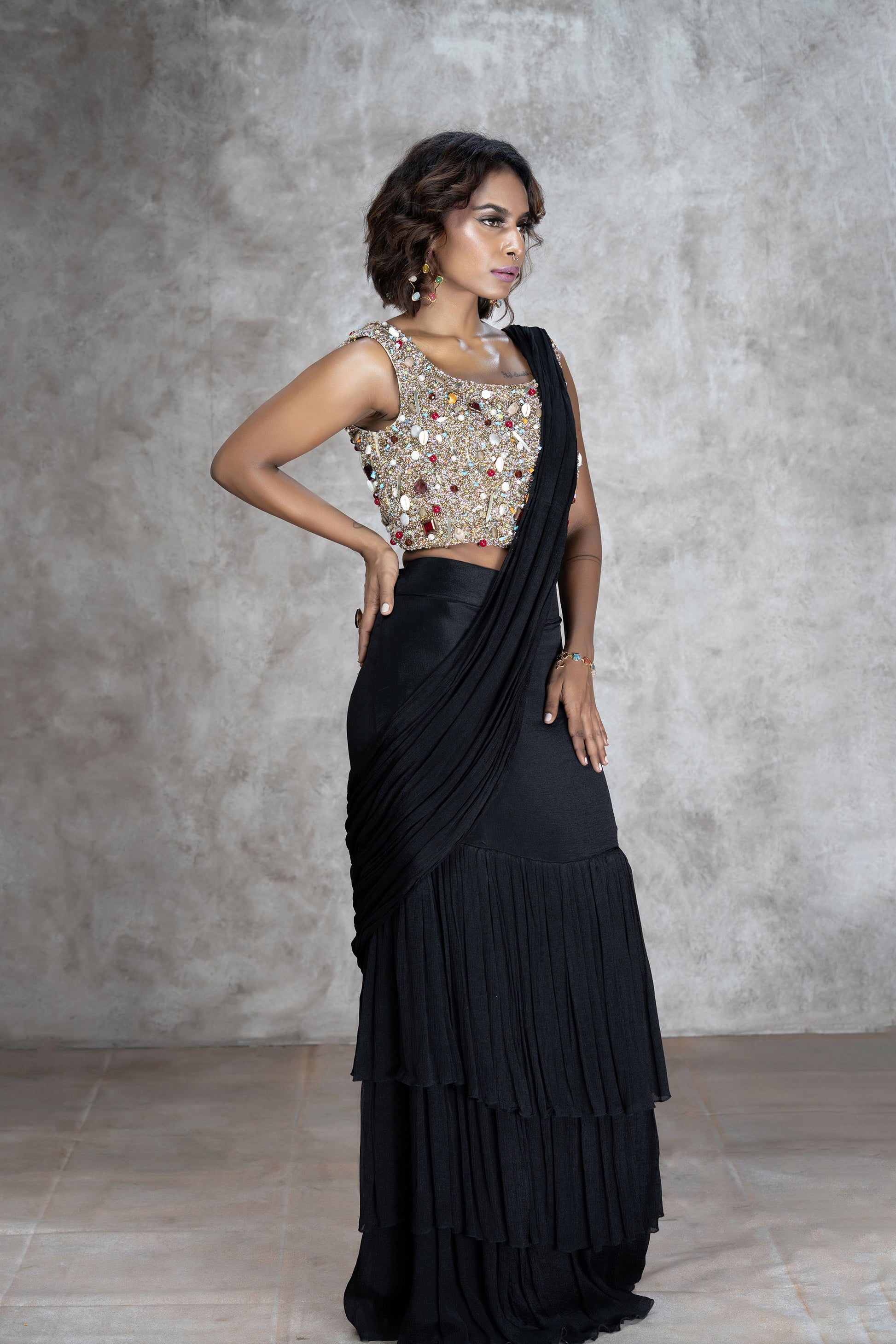 Multi coloured work on the blouse with multiple material paired with a plain black pleated flared saree.