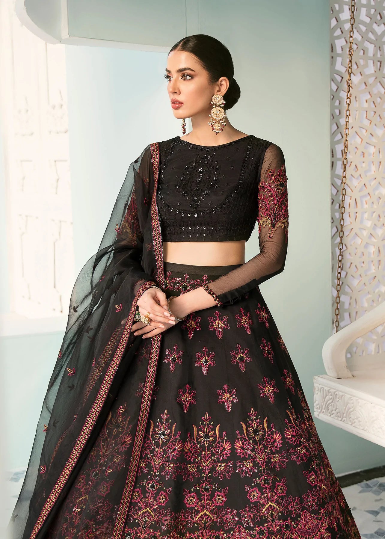 The Floral Embroidery Lehenga is a beautiful black lehenga embroidered with maroon flowers. Its sheer choli is decorated with layers of threads, which makes it look glamorous. The stark black and marron contrast together beautifully.