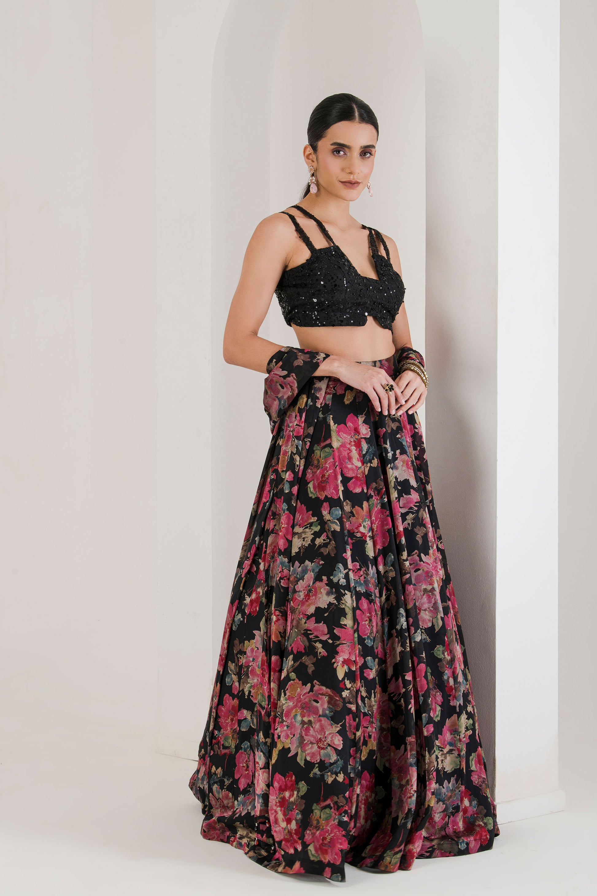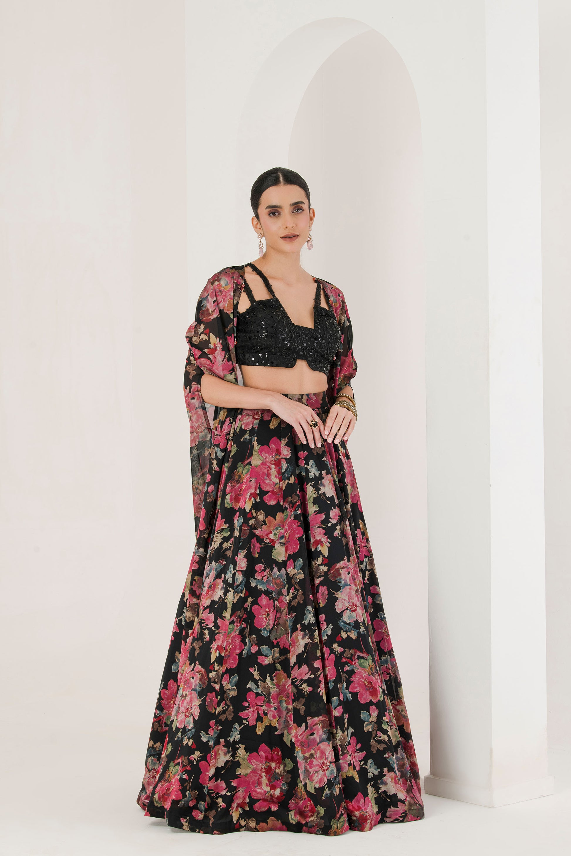 Celebrate your grandeur moments in style by donning this black printed lehenga set. Ornated with sequins and pearls embroidery on the bustier style blouse. Crafted in satin georgette this set is complete with a cape. Perfect for destination weddings this ensemble exudes sophistication and style.