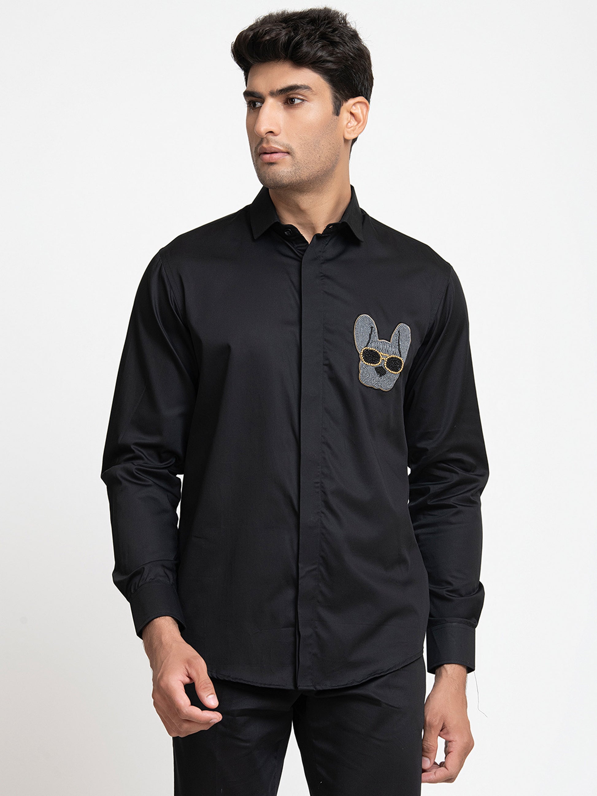 Our shirt features exquisite hand embroidery of a charming dog motif, adorned with shimmering round beads that glisten like morning dew. The unique spring outline adds a touch of playfulness to the design. Concealed buttons provide a seamless finish, ensuring comfort and style in every wear.