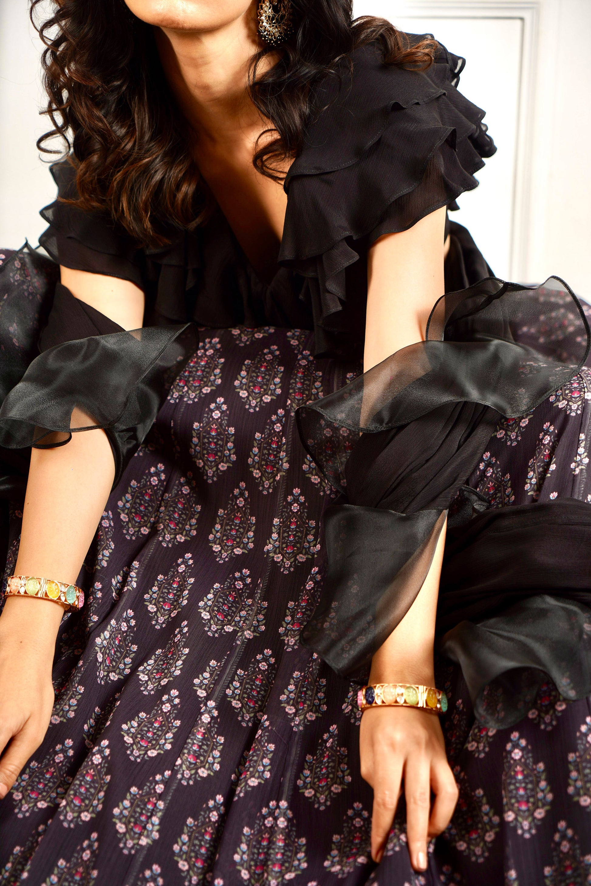 Black Chiffon ruffled blouse paired with Damask Printed Chiffon Lehenga and Ruffled Dupatta