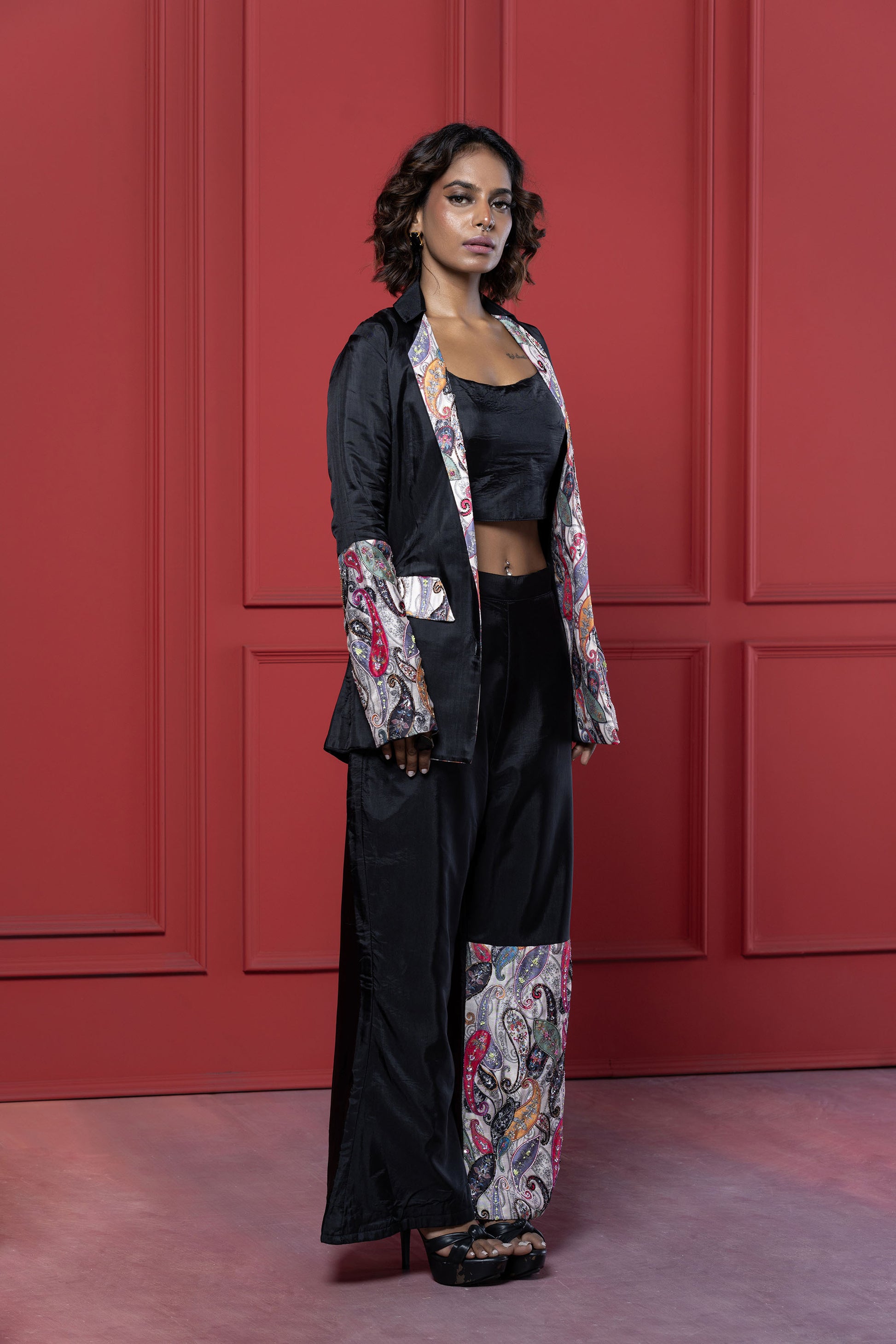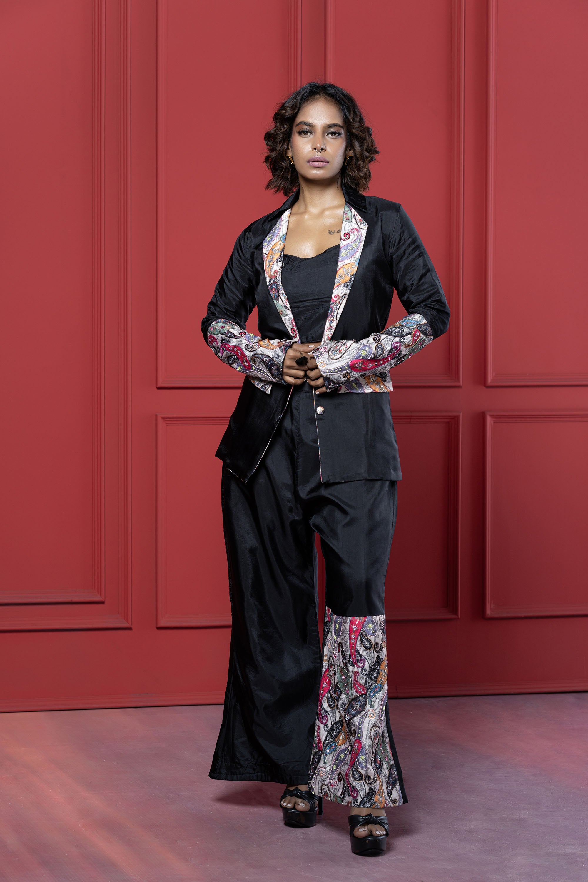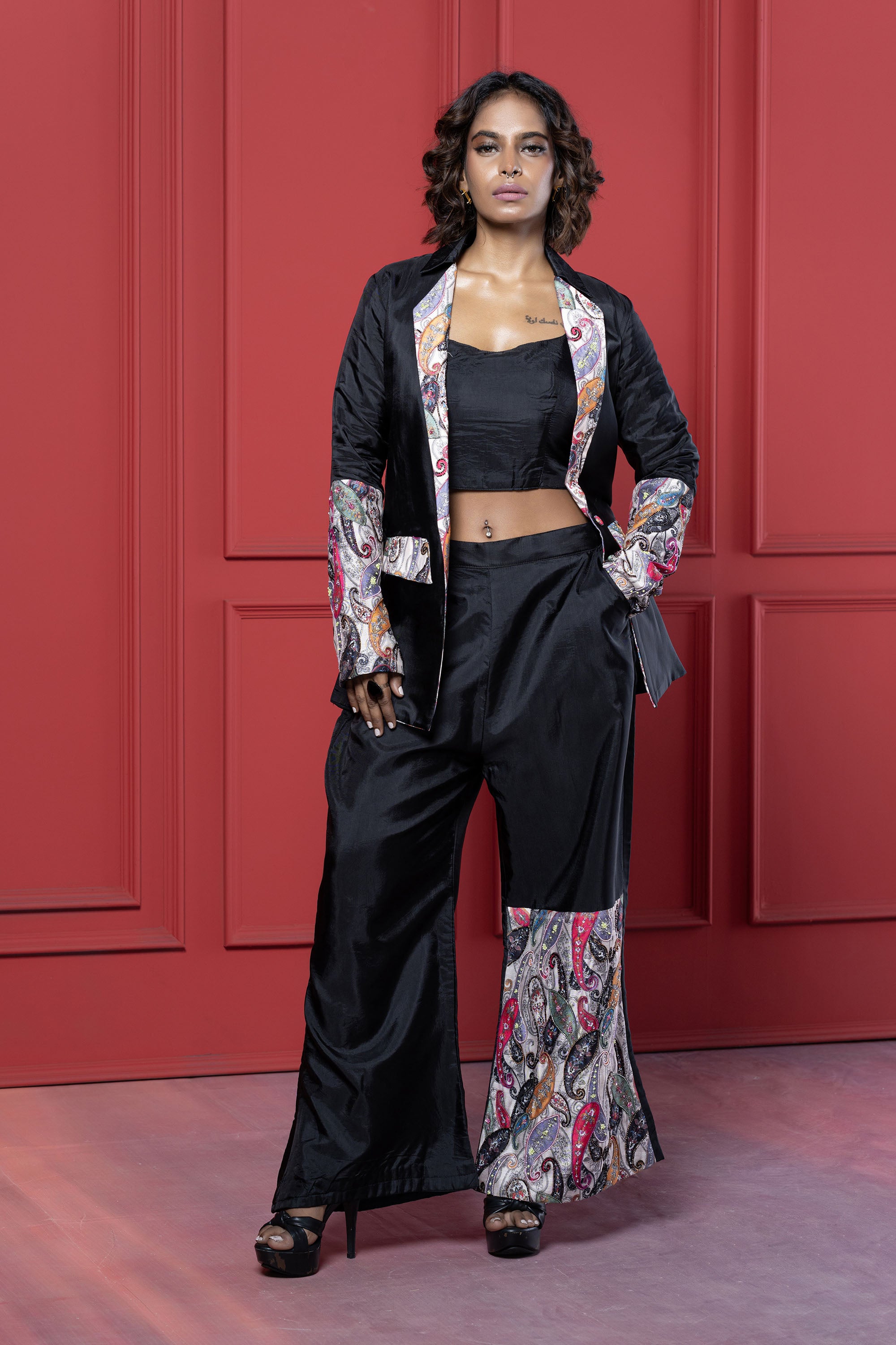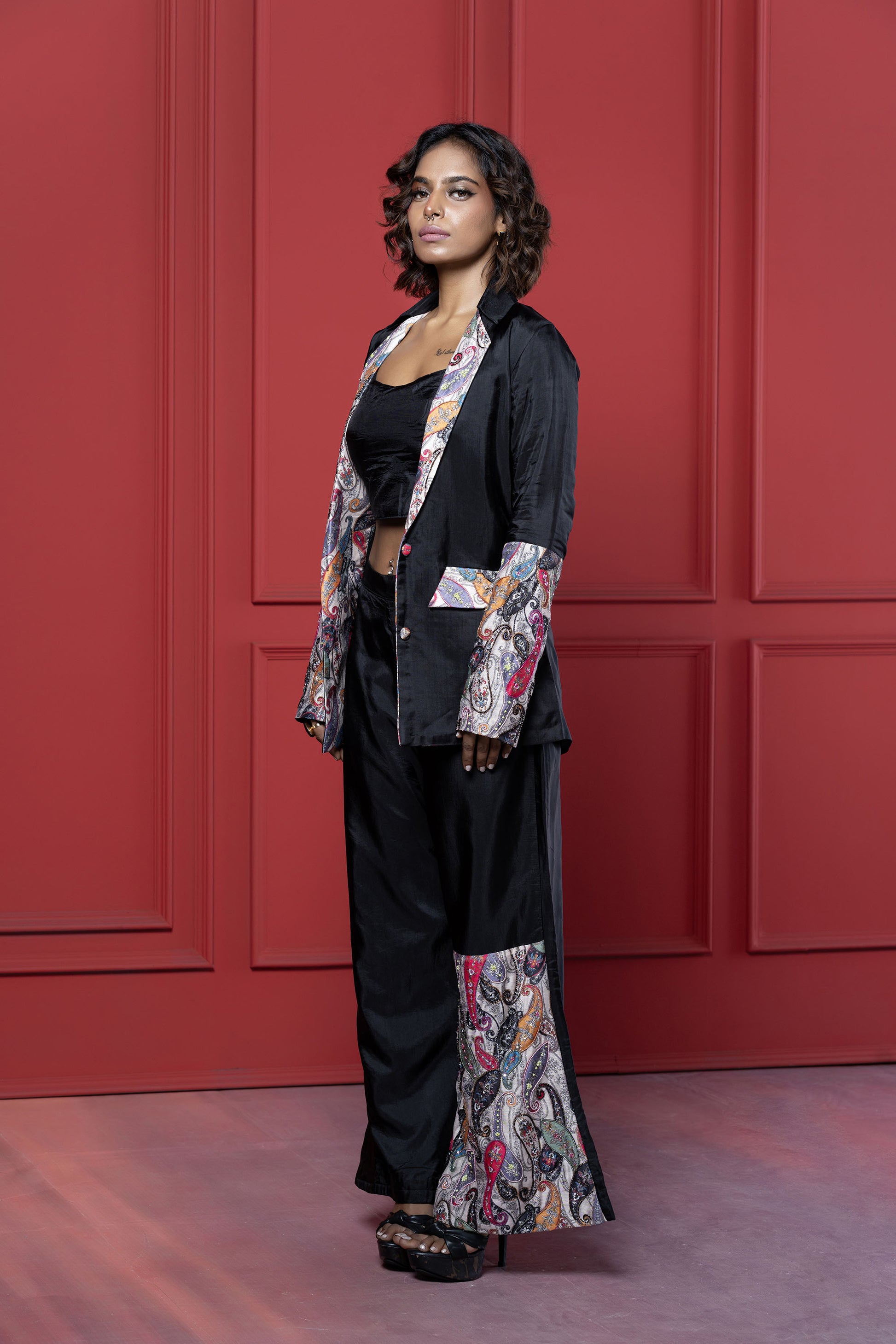 This is a trendy and bold fashion ensemble that combines the elegance of a blazer with artistic patchwork on collar,one-side pant and half sleeve and the motifs is embellished with cutdana work.