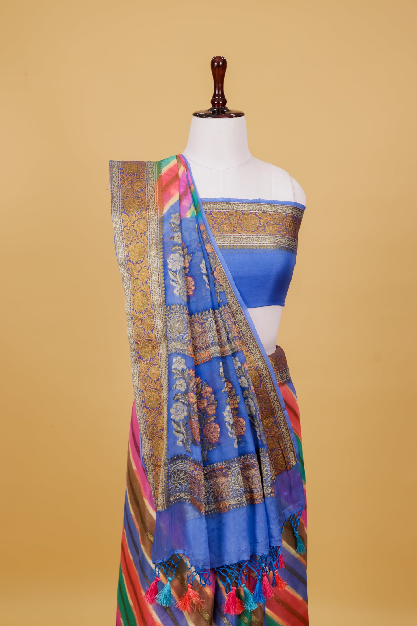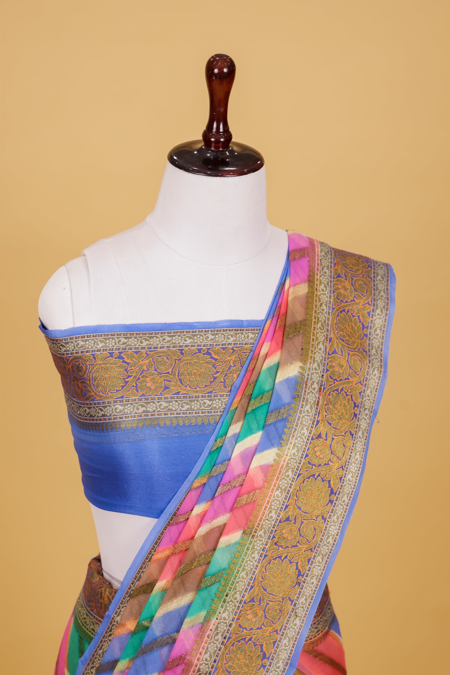 - Description: Banarasi Chiffon Sari with Diagonal pattern and Multi color hand brush paint with Copper zari Border and Aachal