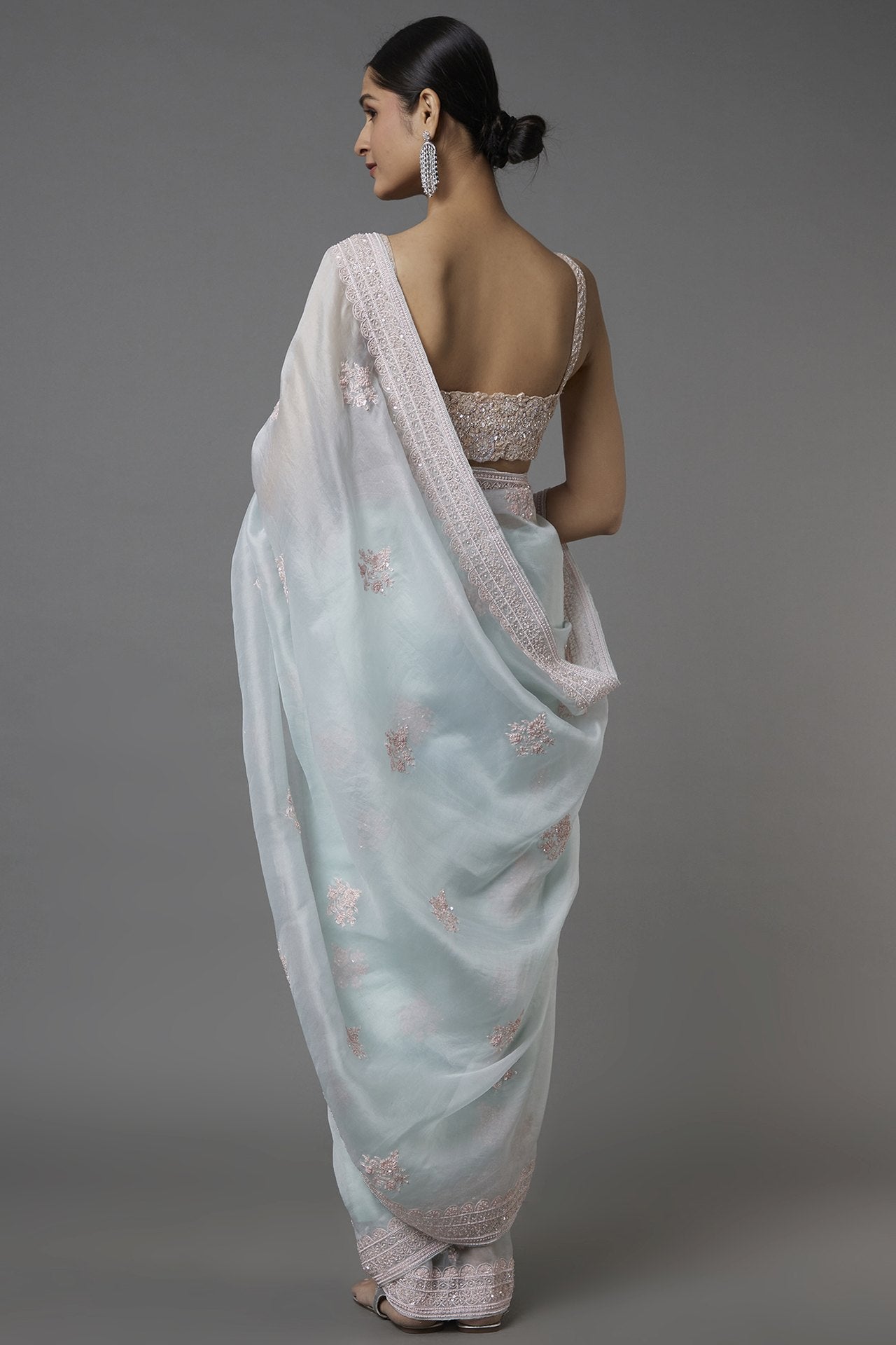 Featuring A Blue Saree In Organza Base With Sequins And Cutdana Embellishments. It Is Paired With A Matching Blouse Having Floral Jaal Embroidery.