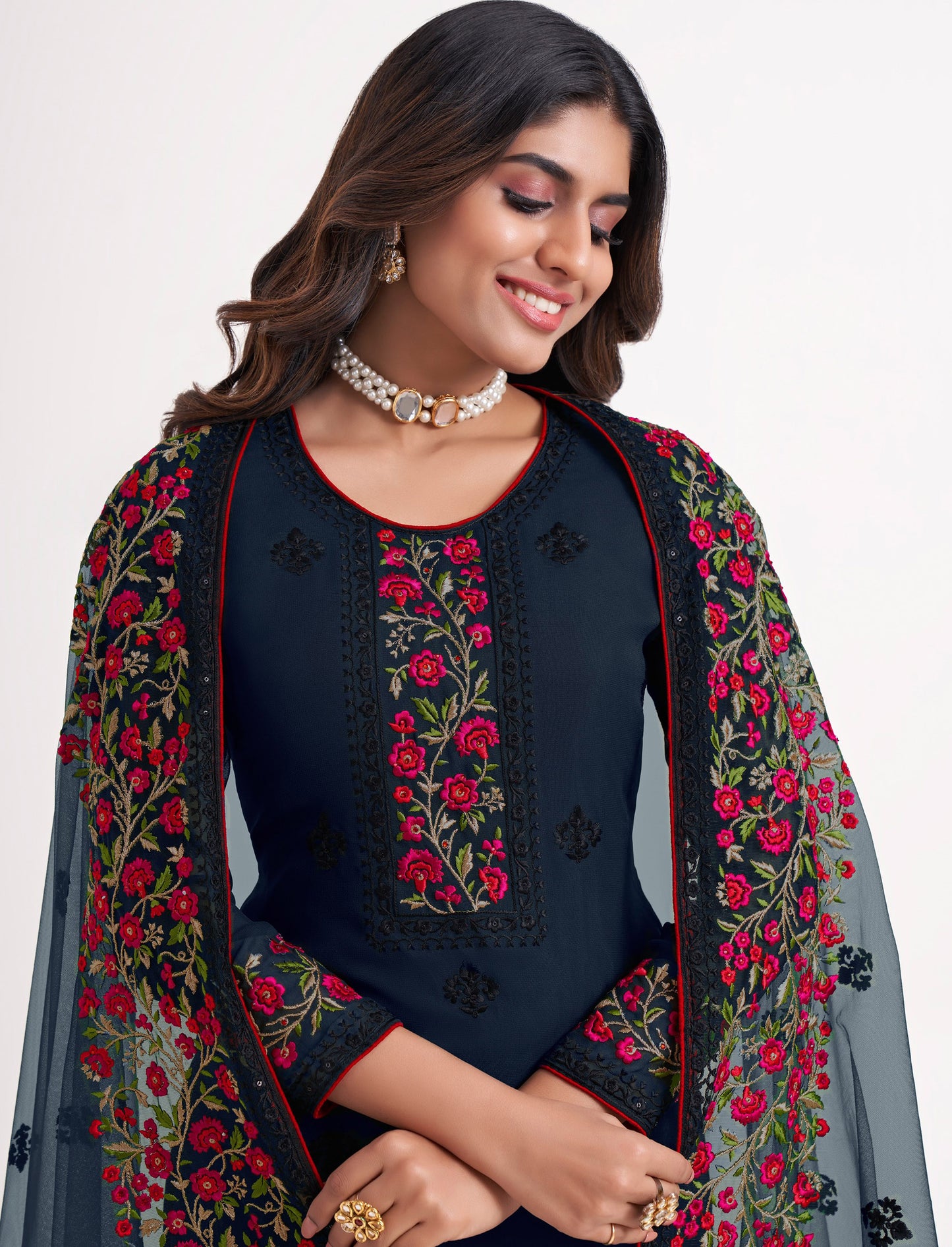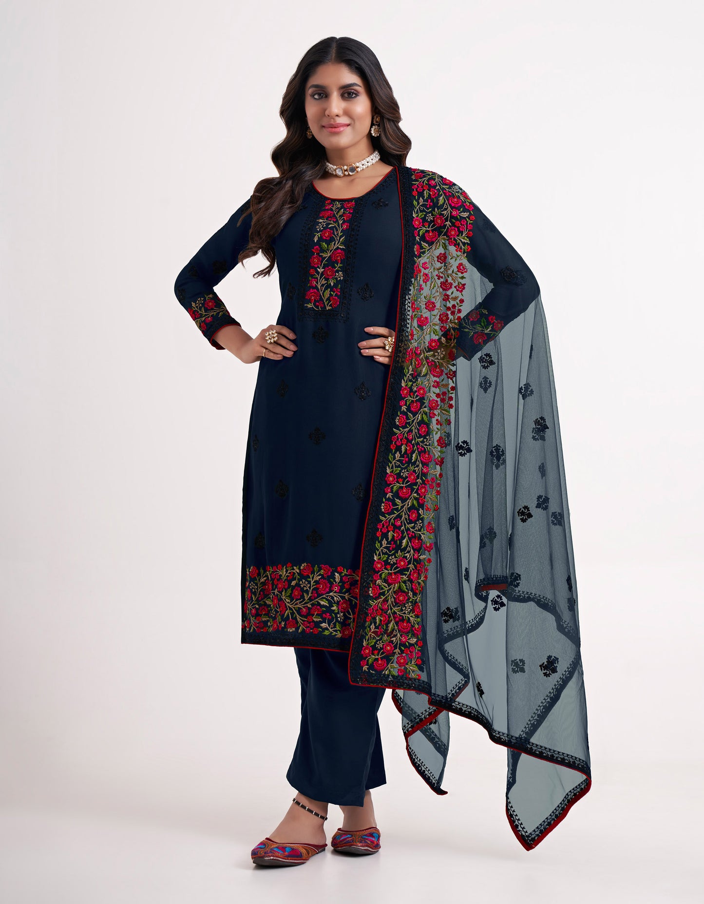 Does your wardrobe need more versatility? Then, check out this . Let you feel the refreshing touch as you adorn this superior-quality Blue Floral Embroidered Georgette Festive Kurta Set to match the overall modest design. If you're yearning to make a fashion statement in your outfit, pick this mirror Embroidered design for any occasion, such as wedding receptions, engagement parties, and sangeets. A wedding Guest would look gorgeous in this Blue Floral Embroidered Georgette Festive Kurta Set . Don't wait. Just go ahead and order.