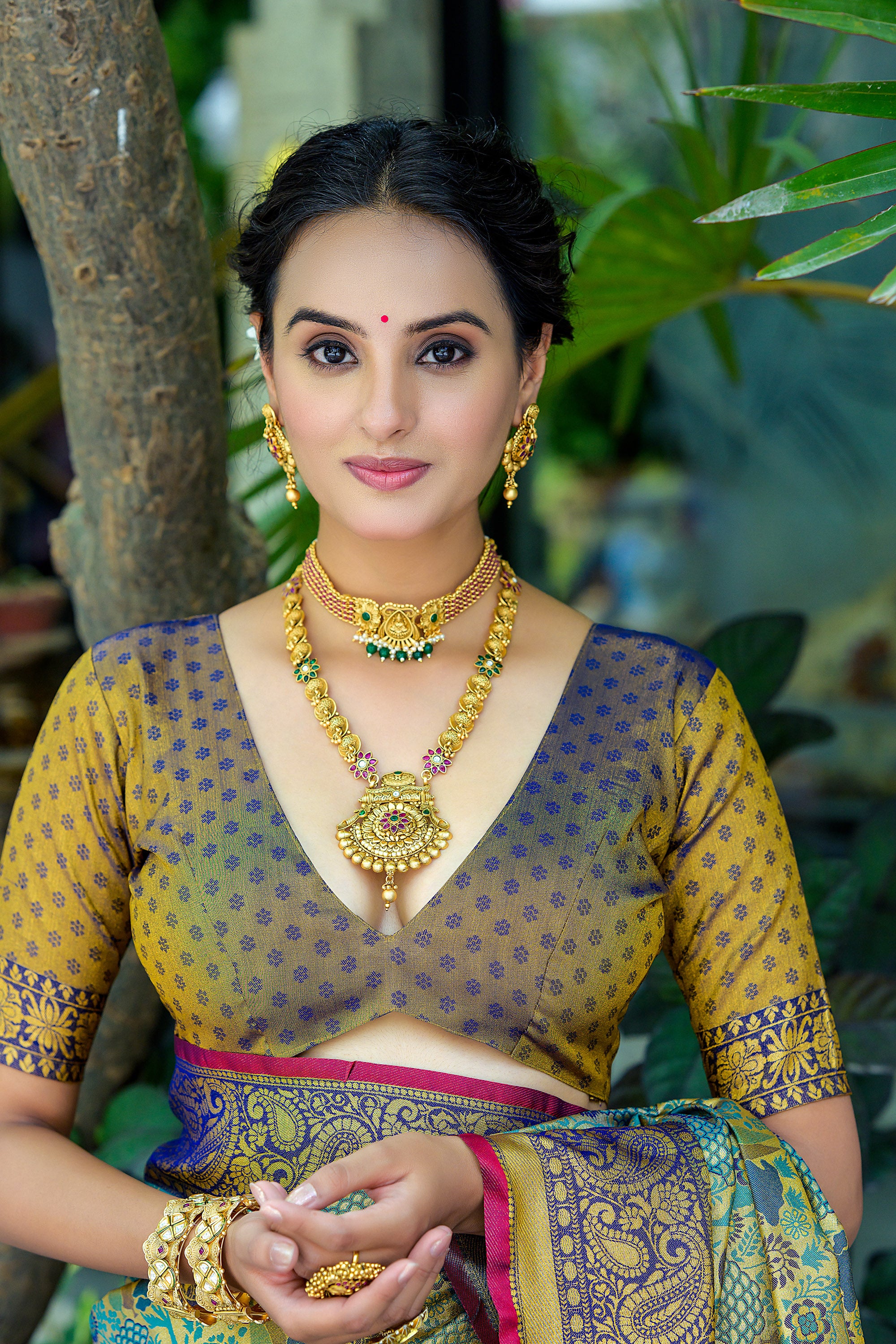 - Layered style: Add depth to your attire by wearing a designer Banarasi saree with a jacket and junk ornaments.
