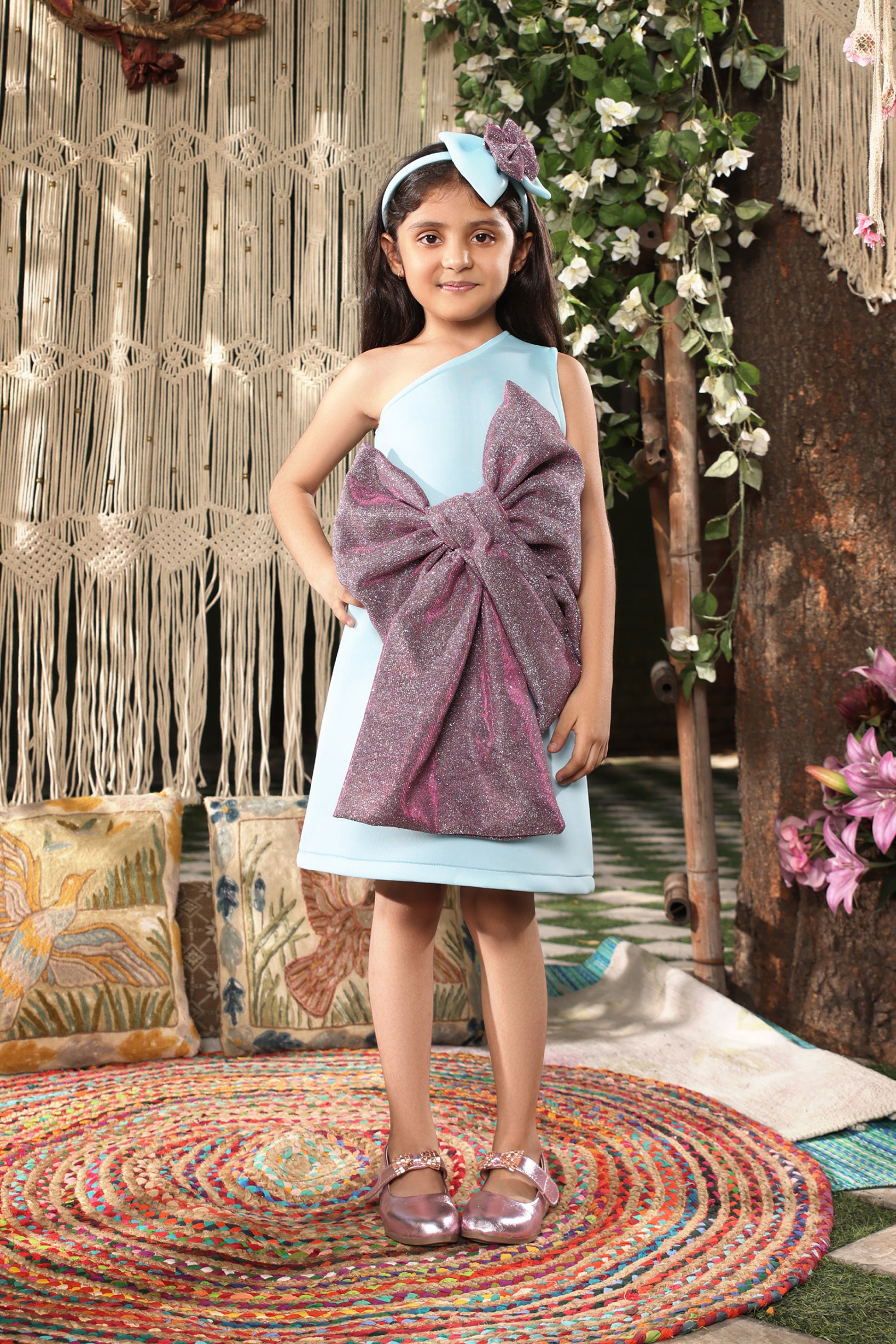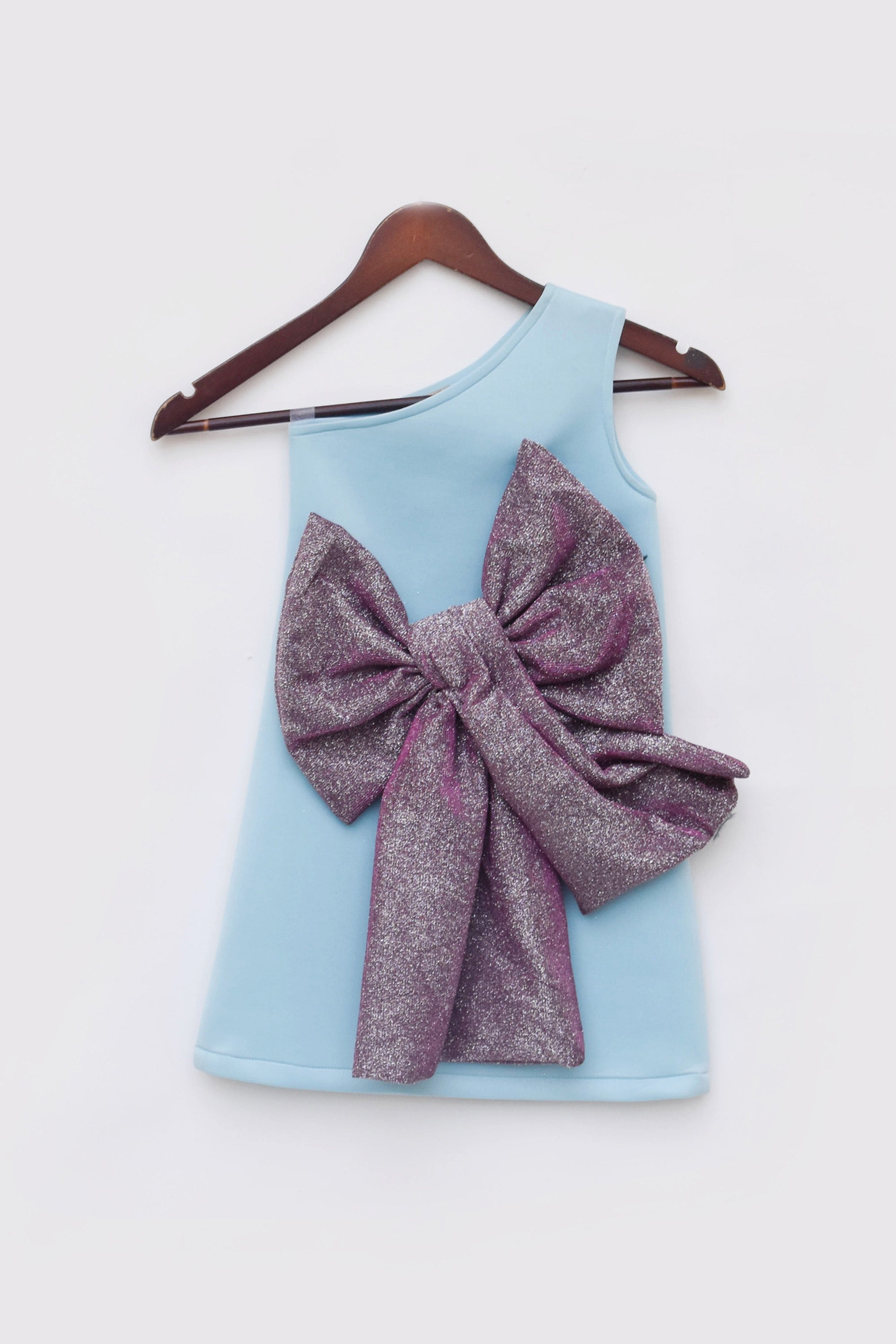 Step into the spotlight with our Blue Lycra Dress with Purple Shimmer Bow. This mesmerizing dress is made from premium blue lycra fabric, offering a comfortable and flattering fit. With its one-shoulder style, it exudes a contemporary and chic vibe. The dress is beautifully adorned with a dazzling purple shimmer bow, delicately attached at the waistline, creating an eye-catching focal point.