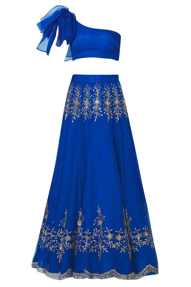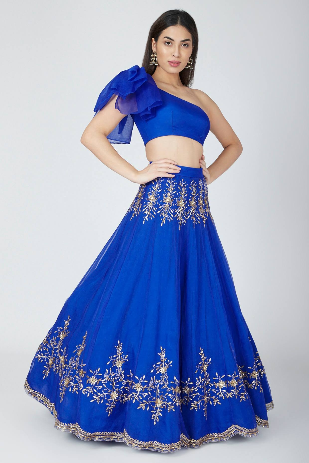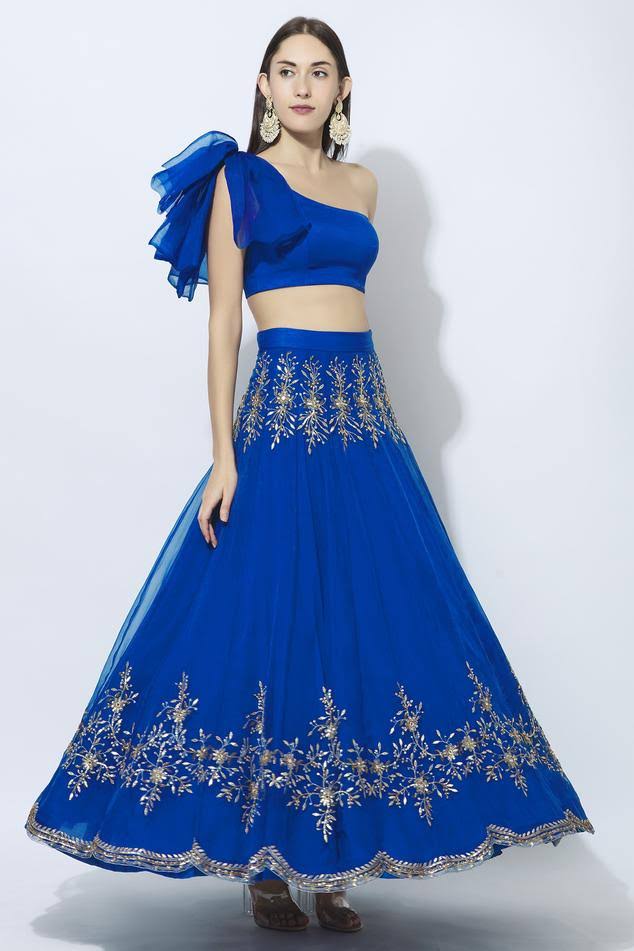 Unleash your inner fashionista with our Blue Organza Nakshi, Gota Embroidered Lehenga Set. Featuring an electric blue skirt in organza base with nakshi, Gota patti, mirror, Moti and sequins embellishments Blue blouse with ruffled one shoulder sleeve. Comes with floral embroidered lehenga. Together, this ensemble creates a look that embodies sophistication and class. Perfect for any formal event, you'll stand out in a crowd with this stunning attire.