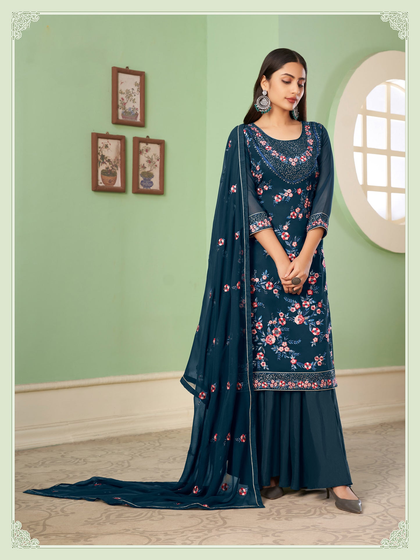 Does your wardrobe need more versatility? Then, check out this refreshing touch as you adorn this superior-quality Blue Sangeet Sharara Floral Embroidered Straight Cut to match the overall modest design.