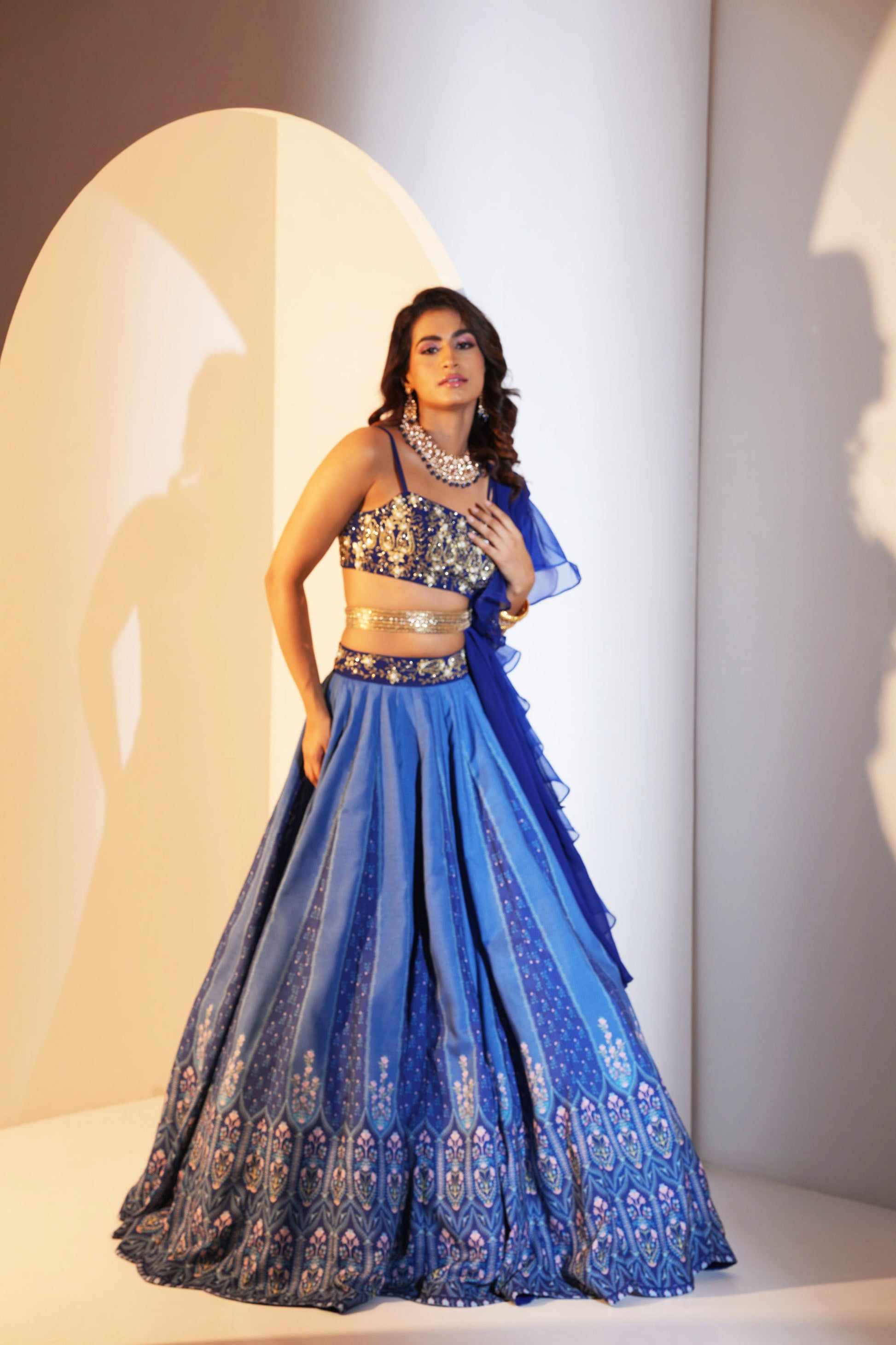 Modal Silk printed lehenga with hand embroidered Georgette blouse  and georgette and organza ruffled dupatta and belt