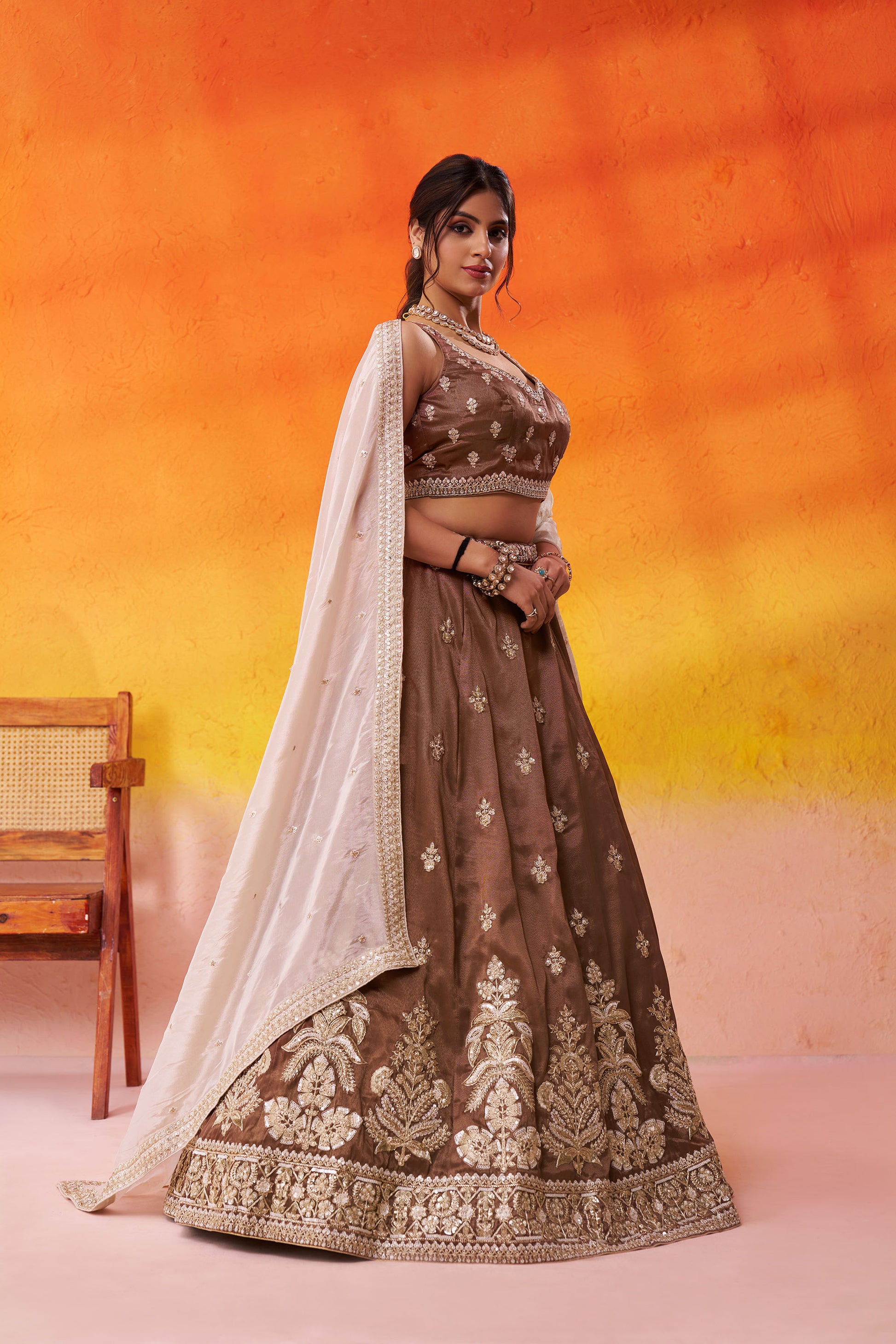 Lehenga:- Made of premium quality Brown Tissue fabric Full Flair Semi-Stitched Lehenga With Moti, Sequins and Coding work has a thread Embroidery work. Has a thread work border on the hemline.