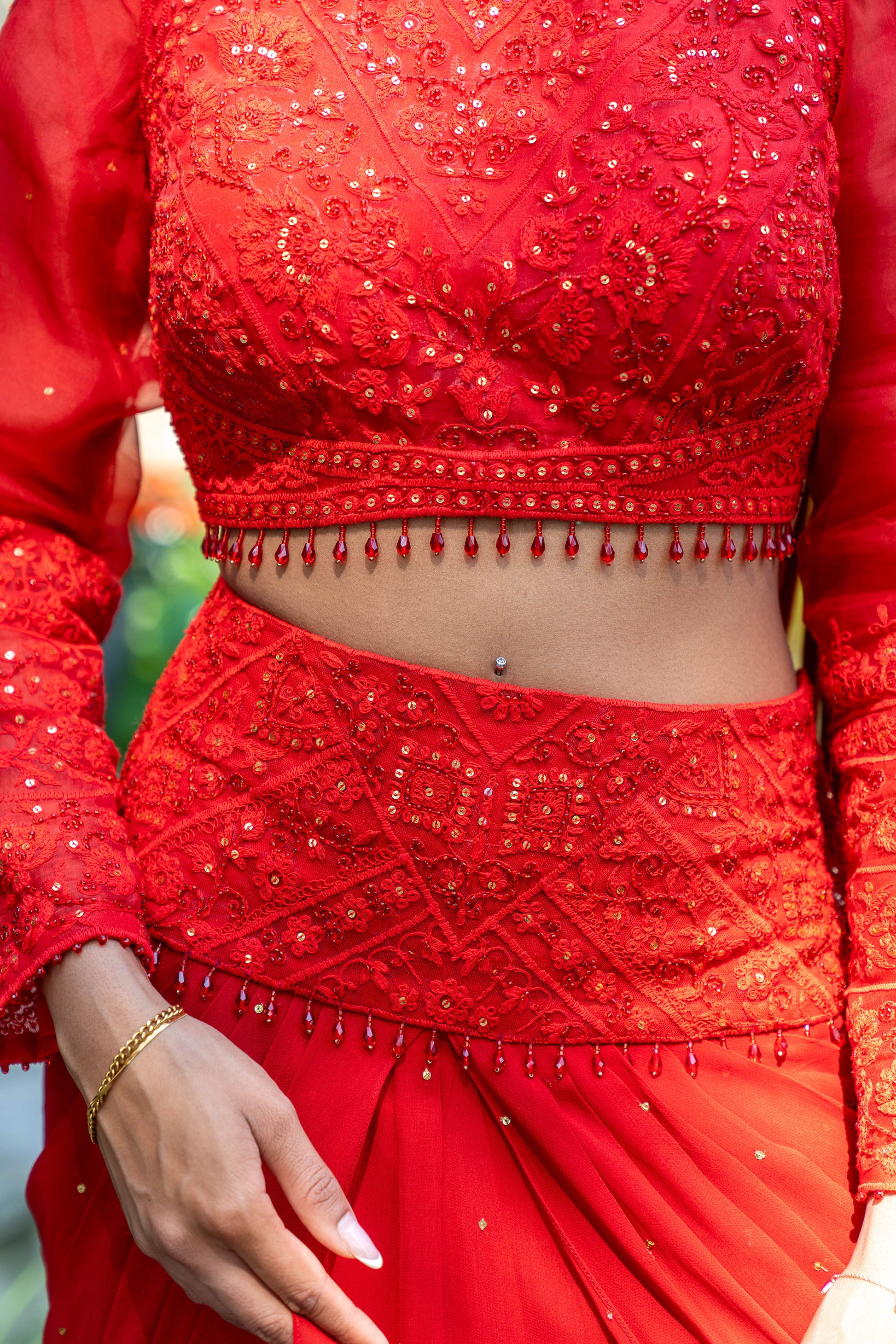 A stunning vision in red, this draped skirt and cold-shoulder blouse set is sure to be a showstopper. Made in organza and georgette, this look is lightweight and easy to carry. It is a contemporary take on the traditional lehenga choli. Complemented by an attached dupatta, this look features intricate thread and sequin work on the blouse and around the skirt waistband, enhanced with hanging beads and handmade tassels.
