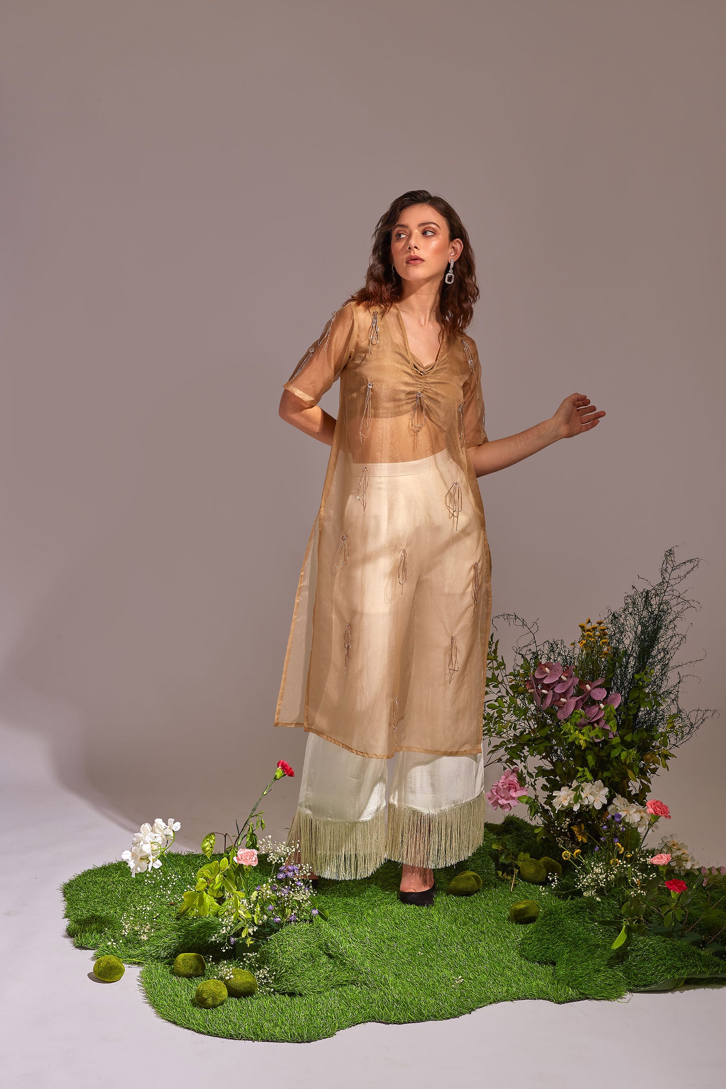 A party wear set in luxurious organza, adorned with intricate embroidered accents. This ensemble includes a flattering bustier for layering, perfectly paired with fringe fit-and-flare pants