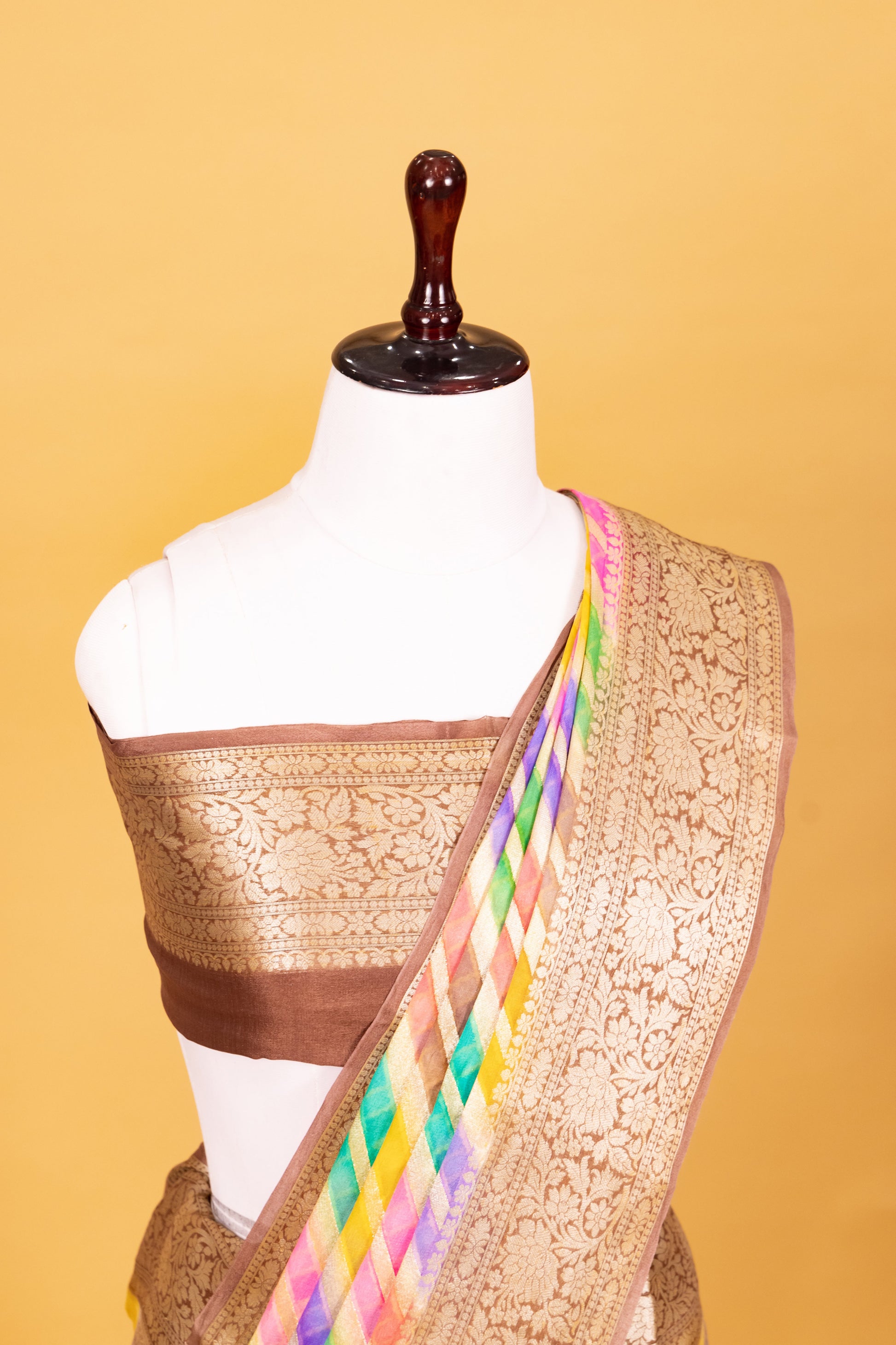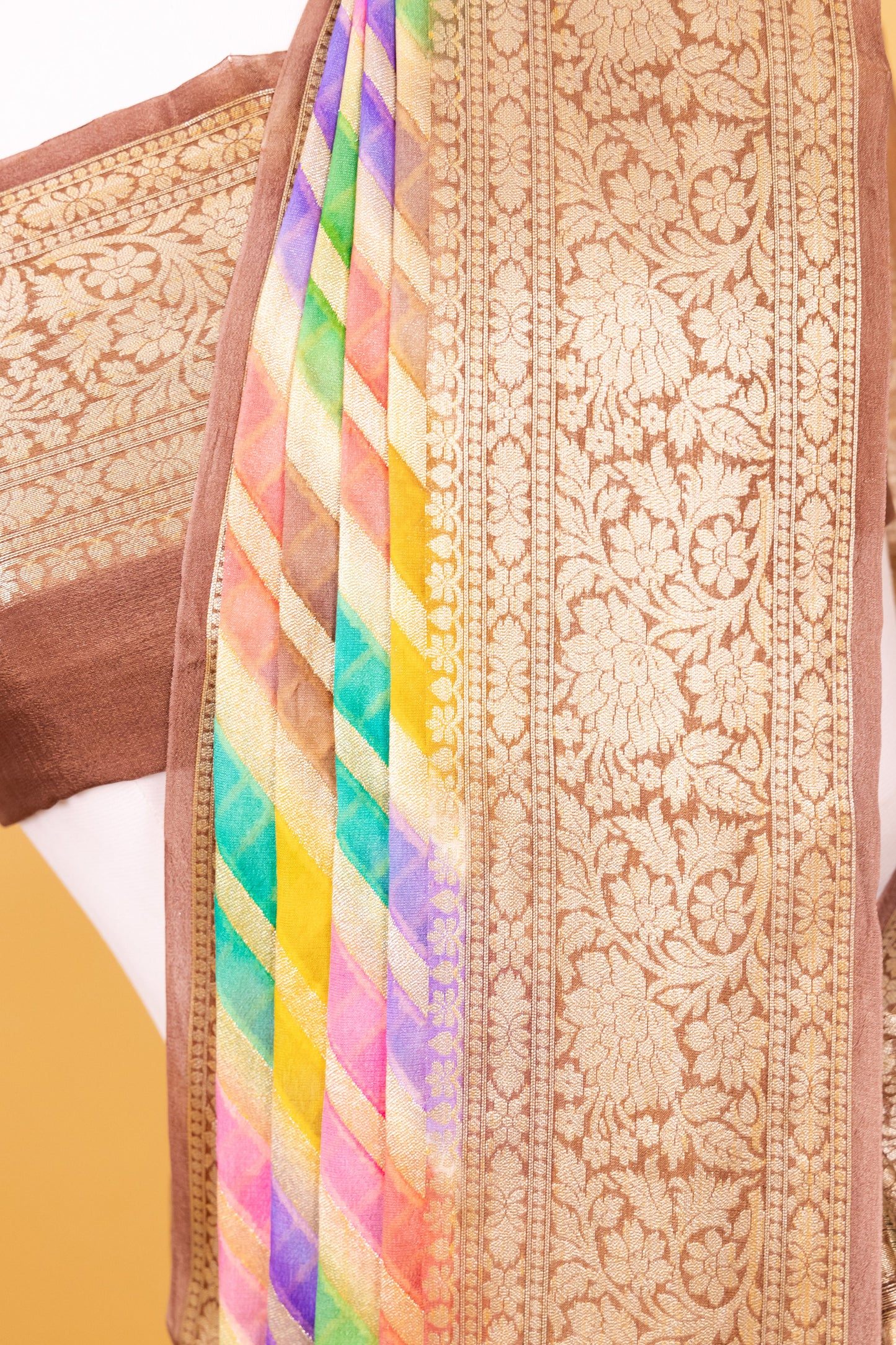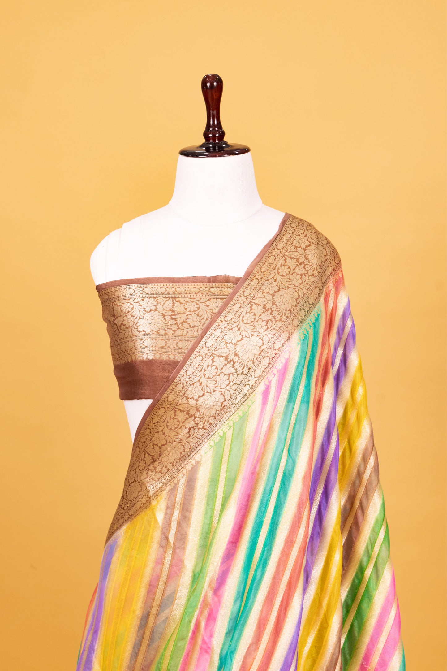 - Description: Banarasi Chiffon Sari with Diagonal pattern and Multi color hand brush paint with Gold zari Border and Aachal