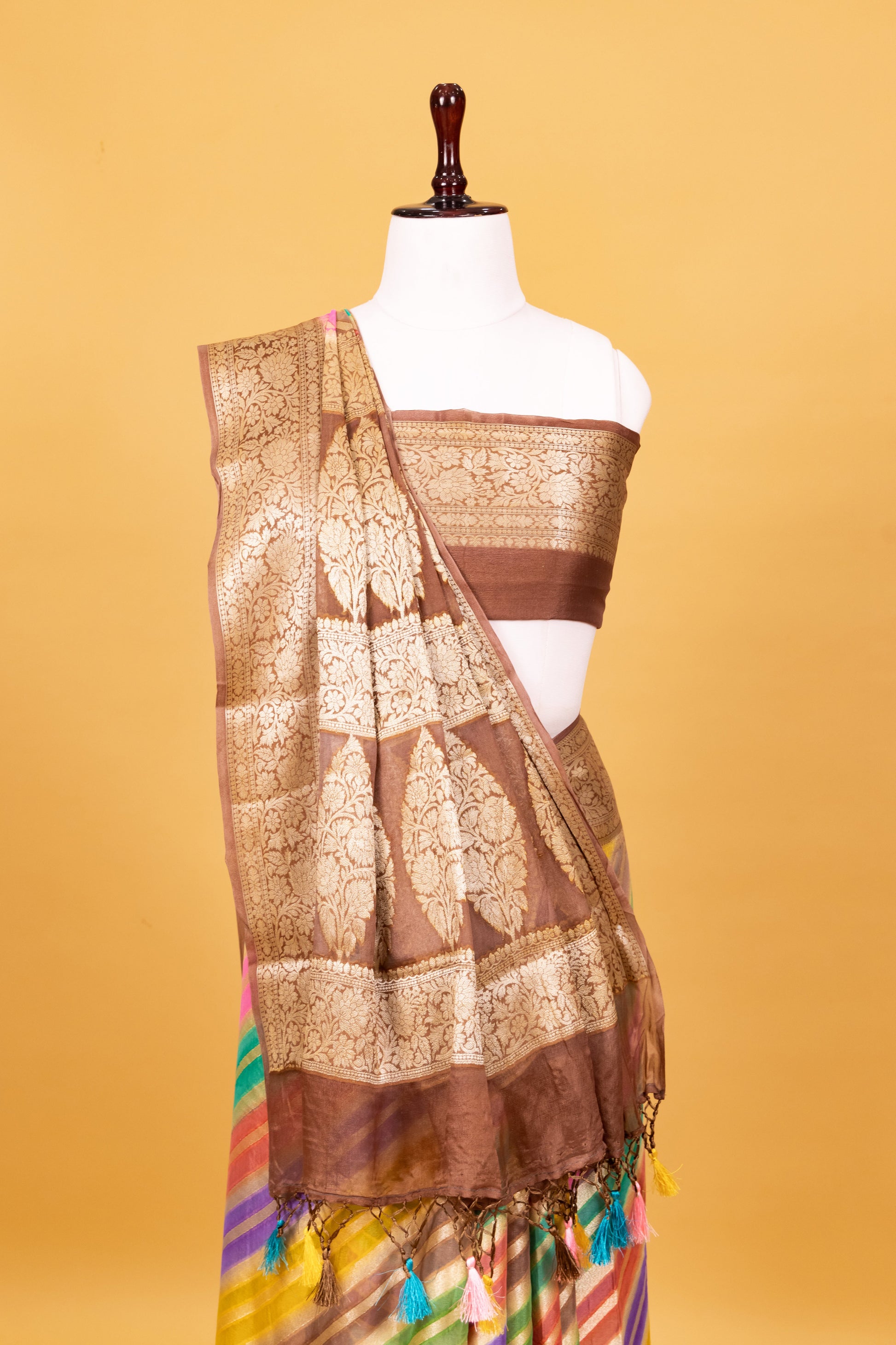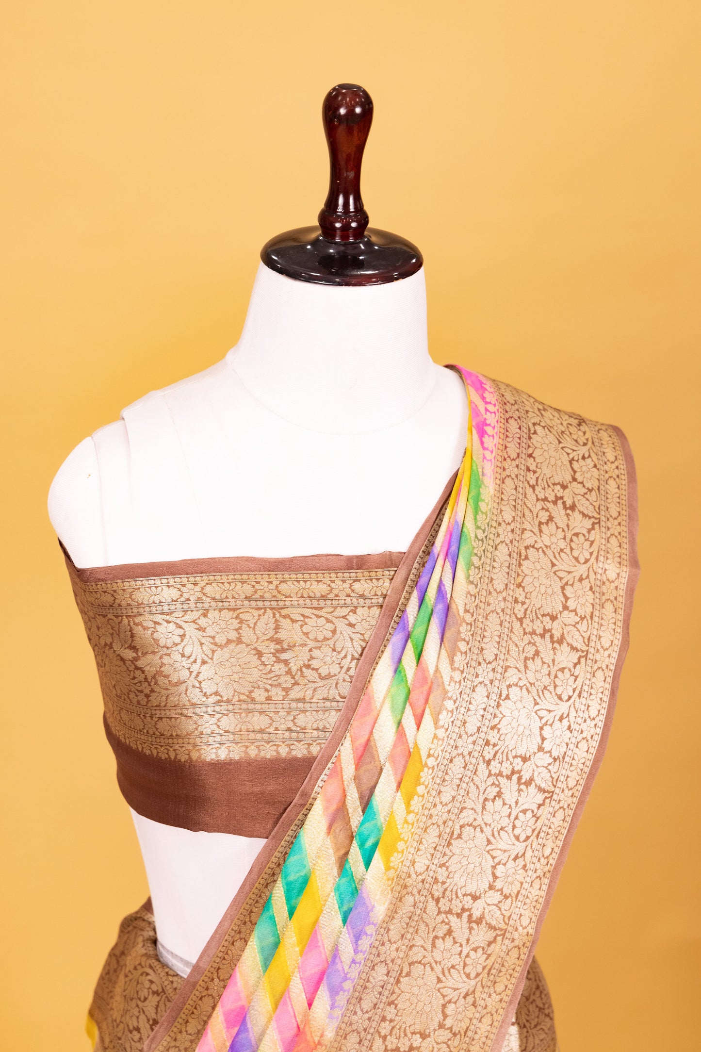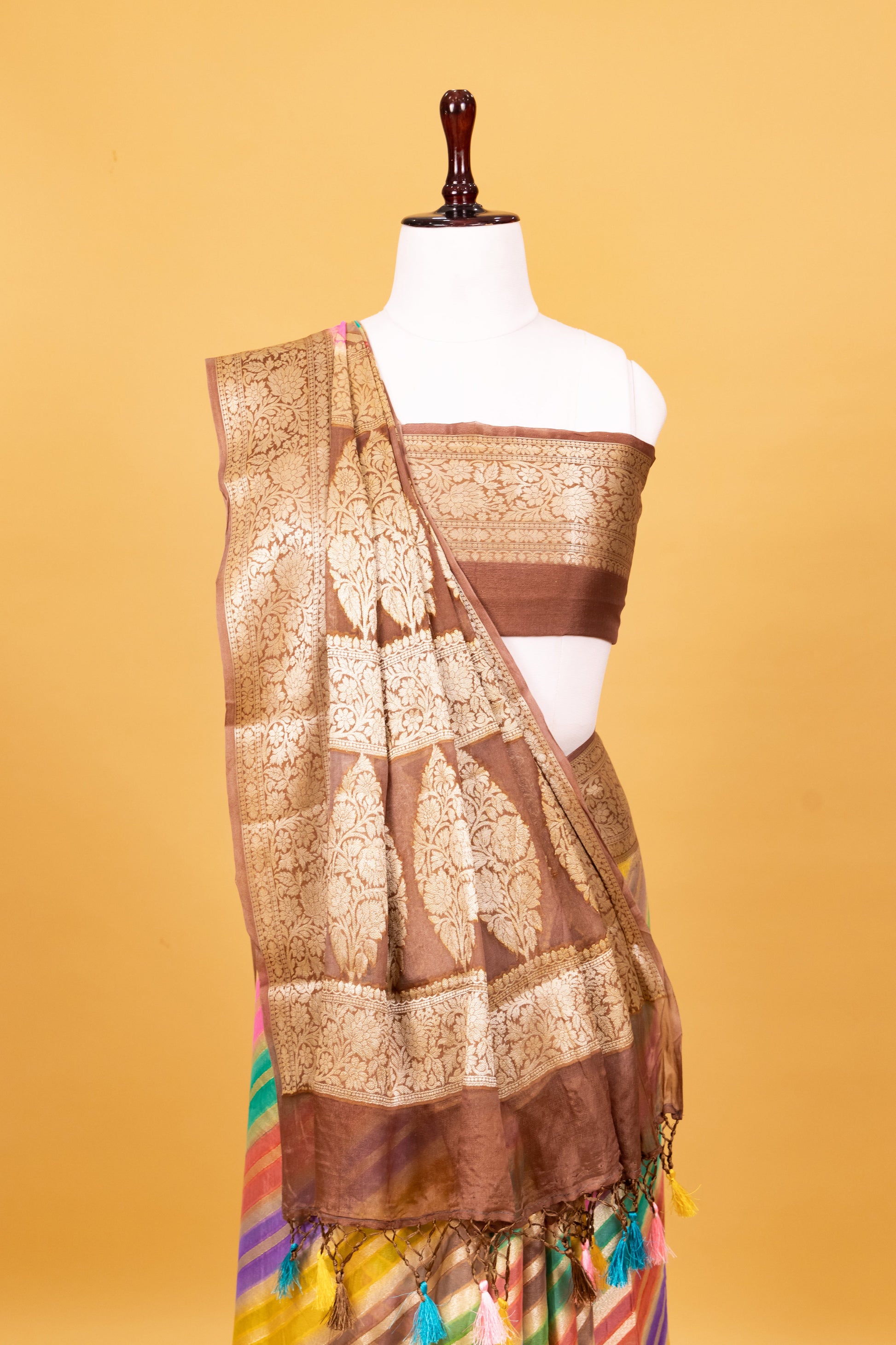 - Description: Banarasi Chiffon Sari with Diagonal pattern and Multi color hand brush paint with Gold zari Border and Aachal