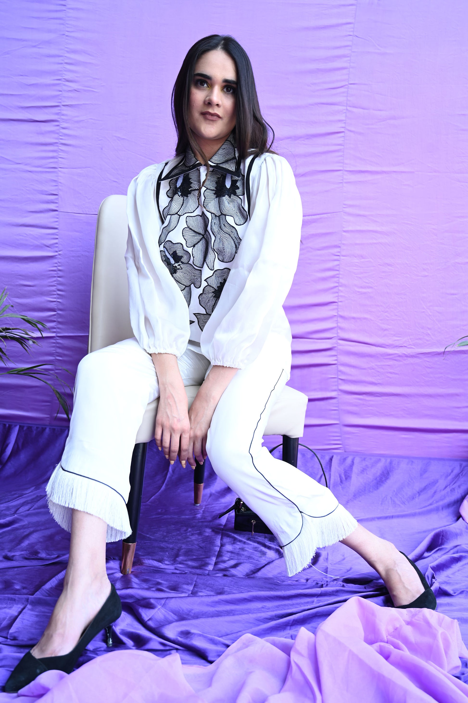 Hand Embroidered shirt yoke with collar Paired with fringes Pants and Thread work.