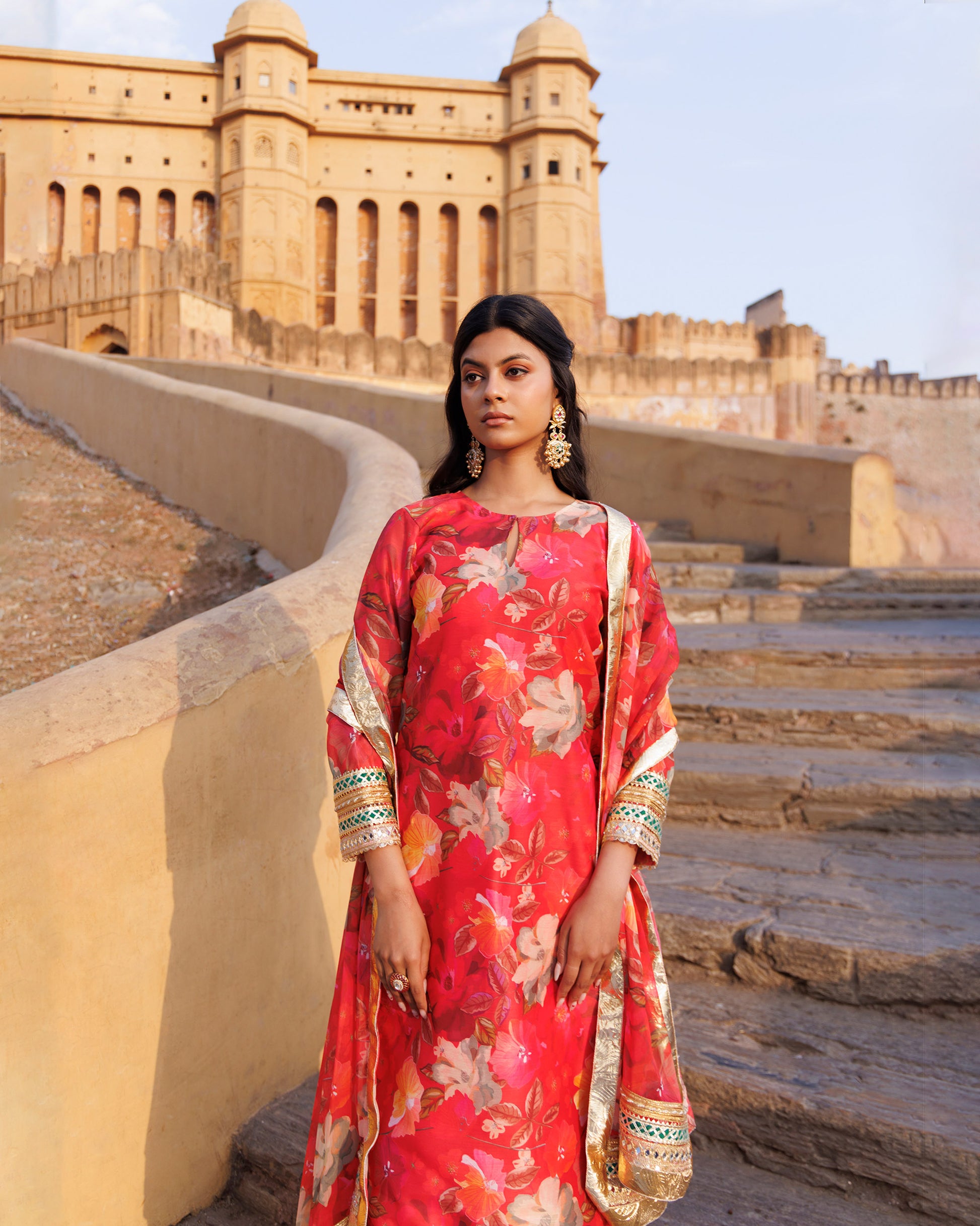 Coral chanderi kurta featuring floral prints with gota, sequin work. Paired with a cotton pant and border embellised Chiffon dupatta.