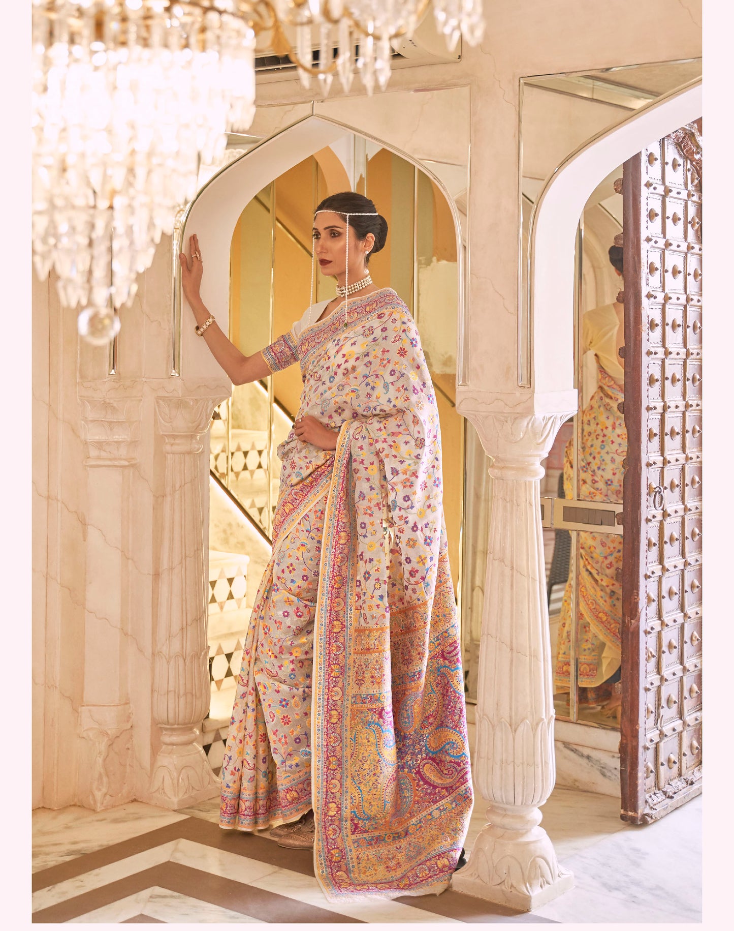 Are you seeking something exclusive? We've got what you require! This Cream Kashmiri Handloom Silk Weave Saree with its gorgeous Zari embroidery and cream color is the perfect option for those seeking to make an impact. You will certainly be the center of attention in this Saree if you wear it to a wedding reception, an engagement party, or a sangeet. Pictured here is a bridesmaid wearing the Green Kashmiri Handloom Silk Weave Saree, which you can purchase today!