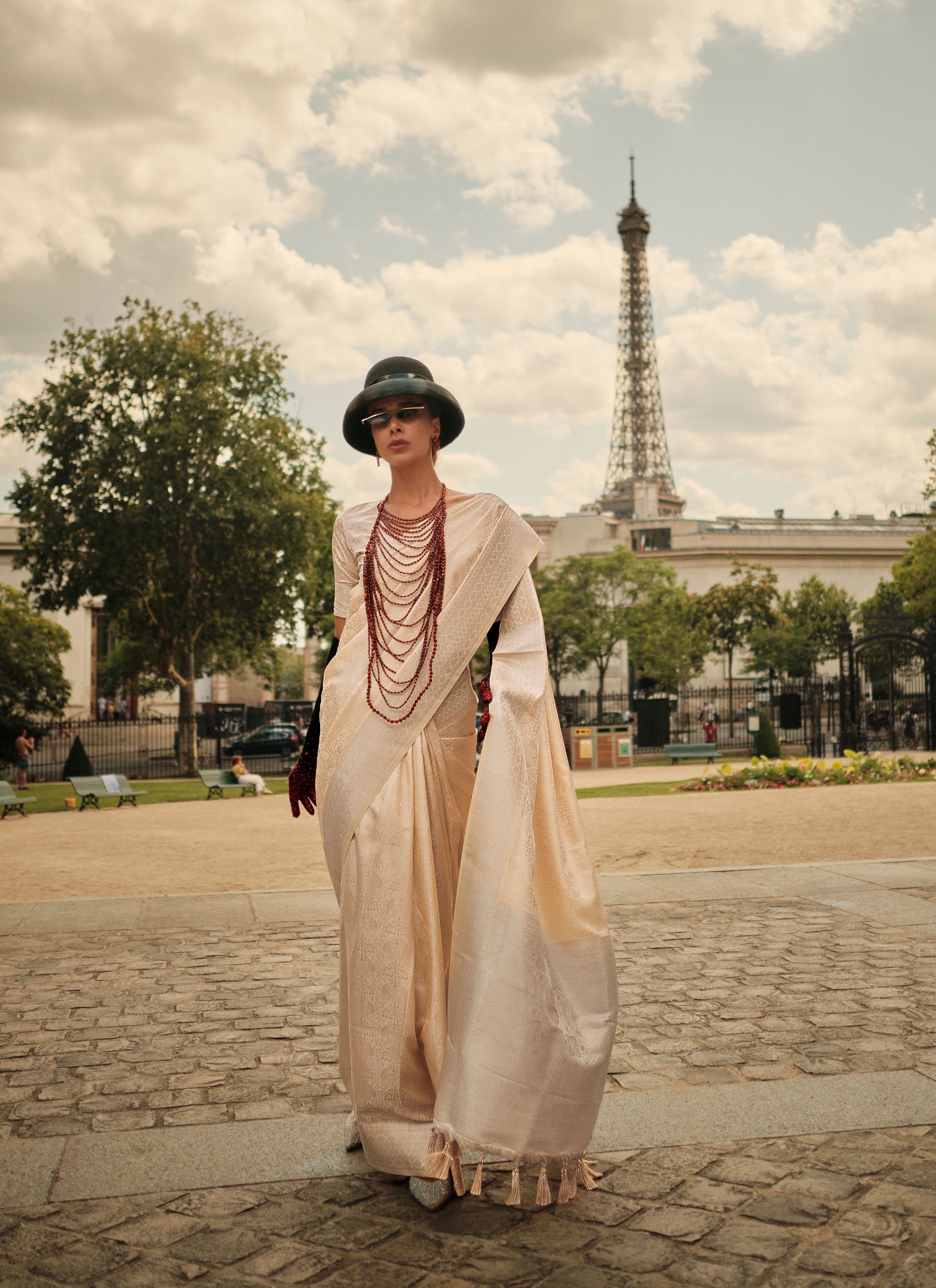 Cream Kavinci Silk Pure Satin Handloom saree