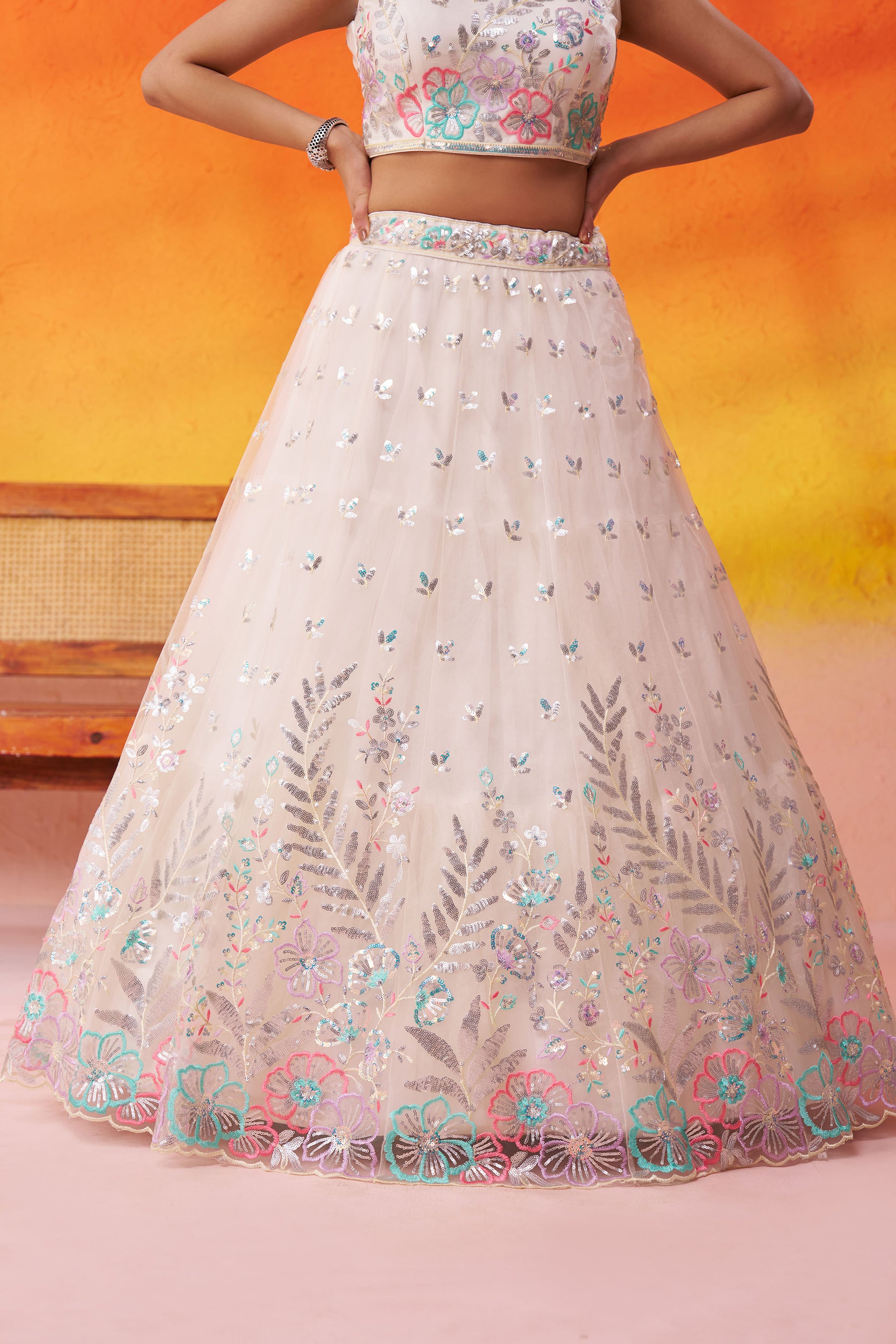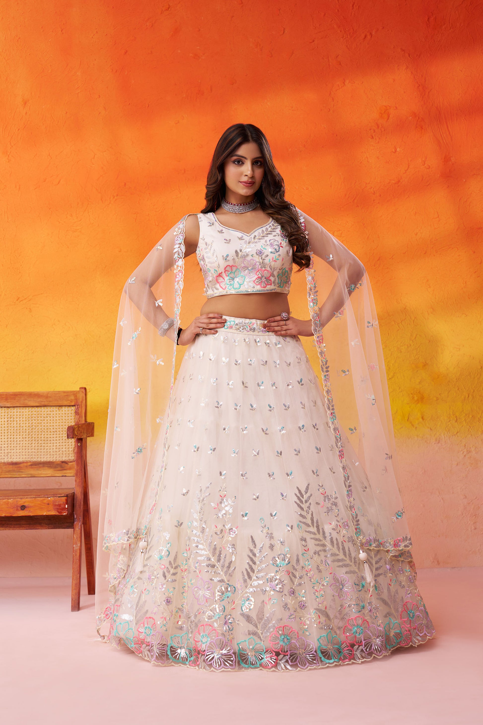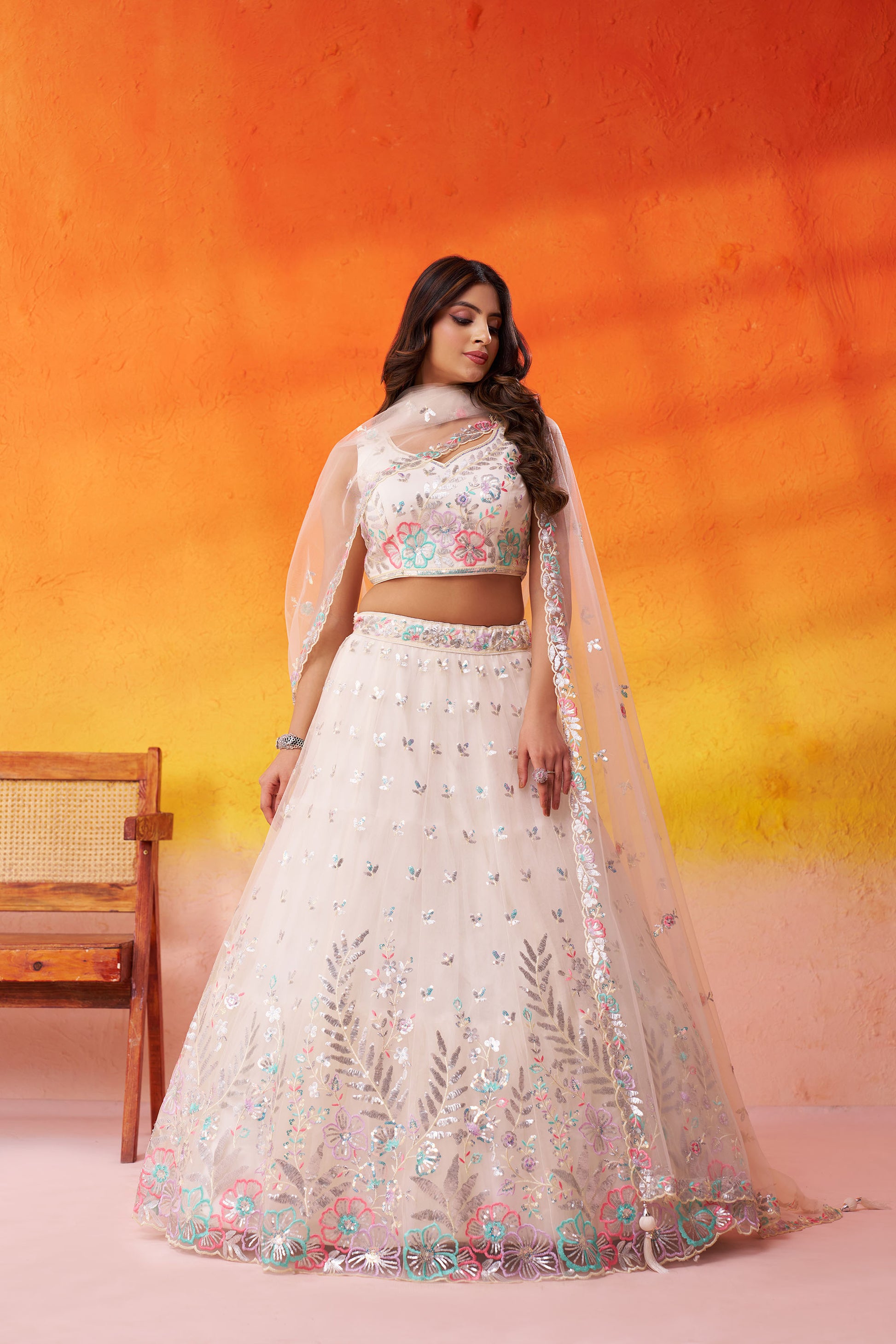 • Lehenga:- Made of premium quality Cream Net fabric Full Flair Lehenga With Sequins and thread Embroidery work. Has a thread work border on the hemline.
