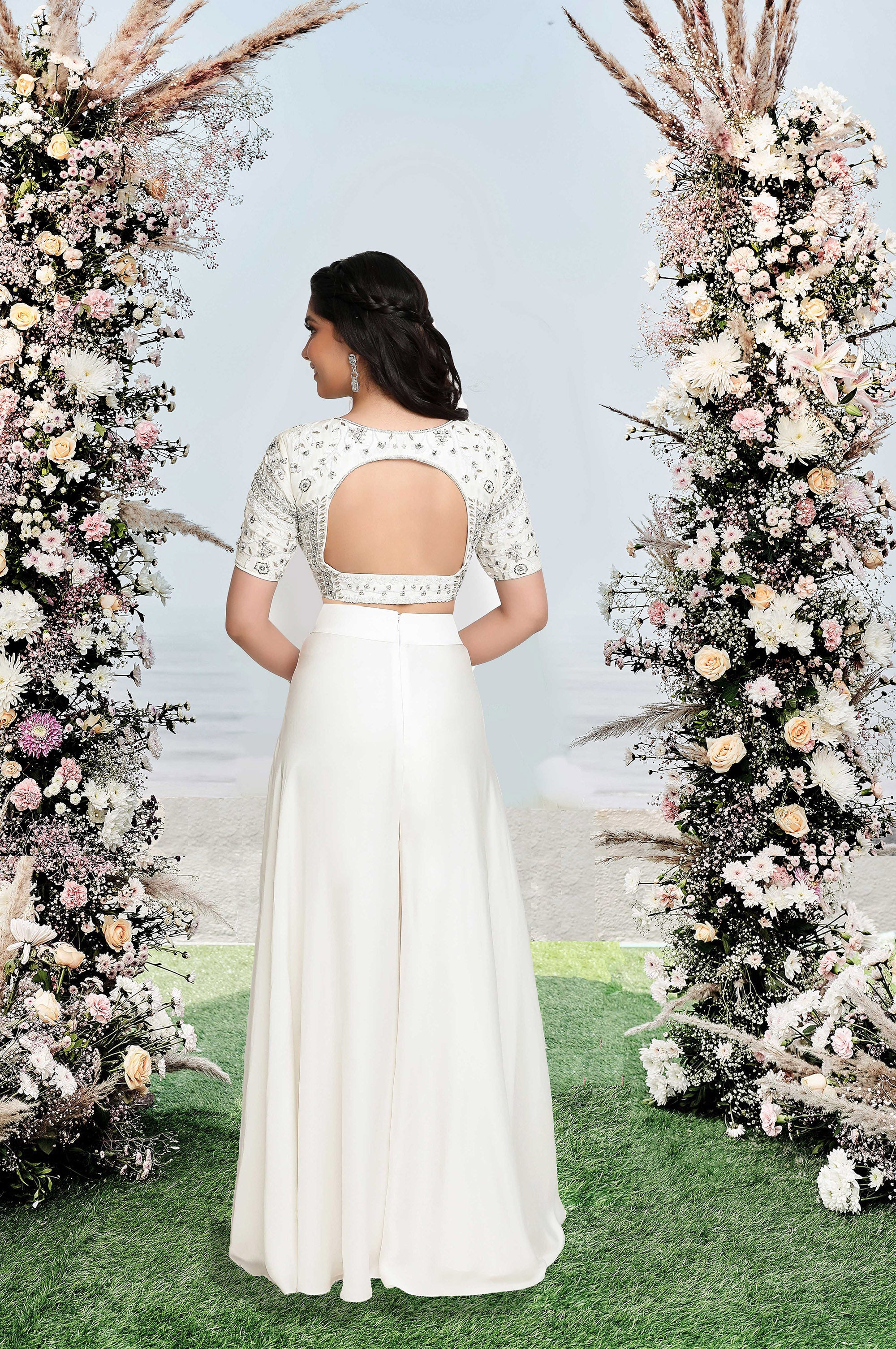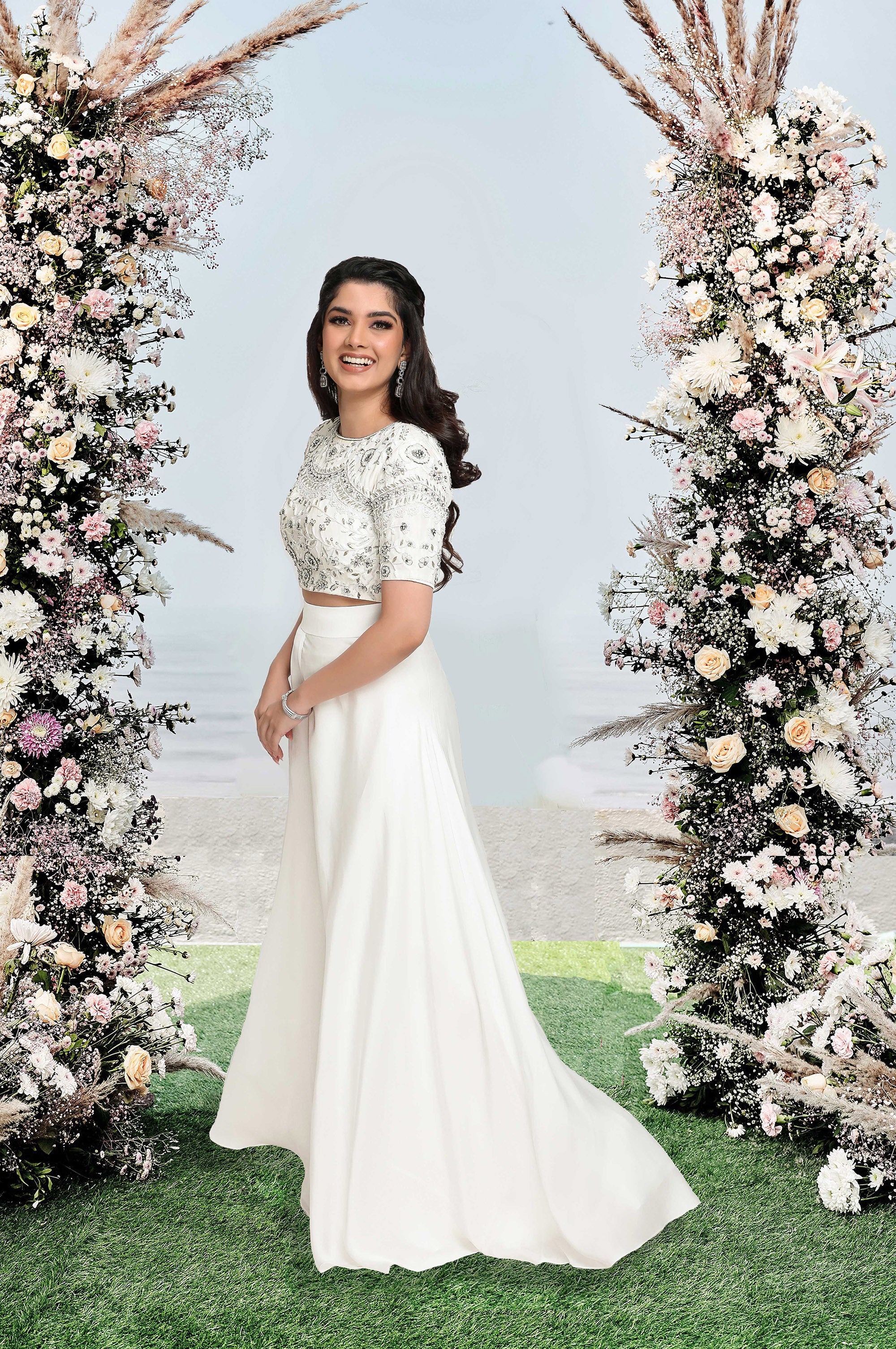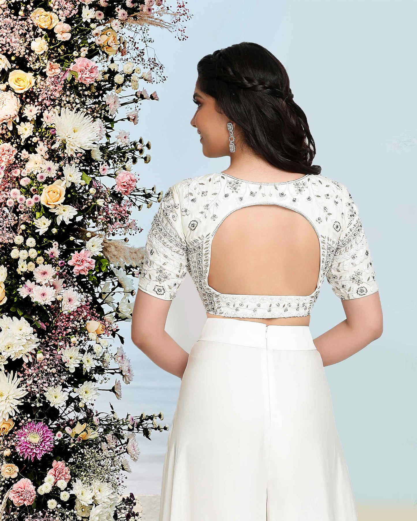Ivory crop top embellished with aari work, stones, pearls,cut dana, and sequins paired with a sharara.