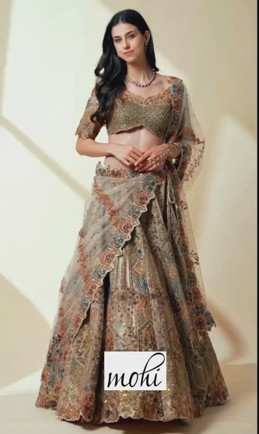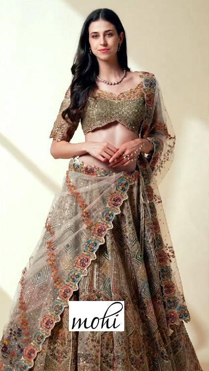 Dark Beige Designer Heavy Embroidered Net Wedding Lehenga